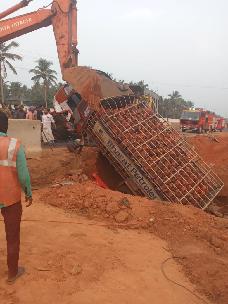 ಅಡುಗೆ ಅನಿಲ ಸಿಲಿಂಡರ್ ಹೇರಿಕೊಂಡು ತೆರಳುತ್ತಿದ್ದ ಲಾರಿ ಮತ್ತು ಇನ್ನೊಂದು ಸರಕು ಲಾರಿ ನಡುವೆ ಅಪಘಾತ ನಡೆದಿದೆ ಎನ್ನಲಾಗಿದೆ. ಢಿಕ್ಕಿಯ ರಭಸಕ್ಕೆ ನಿಯಂತ್ರಣ ತಪ್ಪಿದ ಸಿಲಿಂಡರ್ ಲಾರಿಯು ರಾಷ್ಟ್ರೀಯ ಹೆದ್ದಾರಿ ಬದಿ ಫಿಲ್ಲರ್ ನಿರ್ಮಾಣಕ್ಕೆ ತೊಡಲಾದ ಹೊಂಡಕ್ಕೆ ಬಿದ್ದಿದೆ.  ಅಪಘಾತದ ಹಿನ್ನಲೆಯಲ್ಲಿ ಕೆಲ ಸಮಯ ರಾಷ್ಟ್ರೀಯ ಹೆದ್ದಾರಿಯಲ್ಲಿ ವಾಹನ ಸಂಚಾರಕ್ಕೆ ಅಡ್ಡಿಯಾಯಿತು.