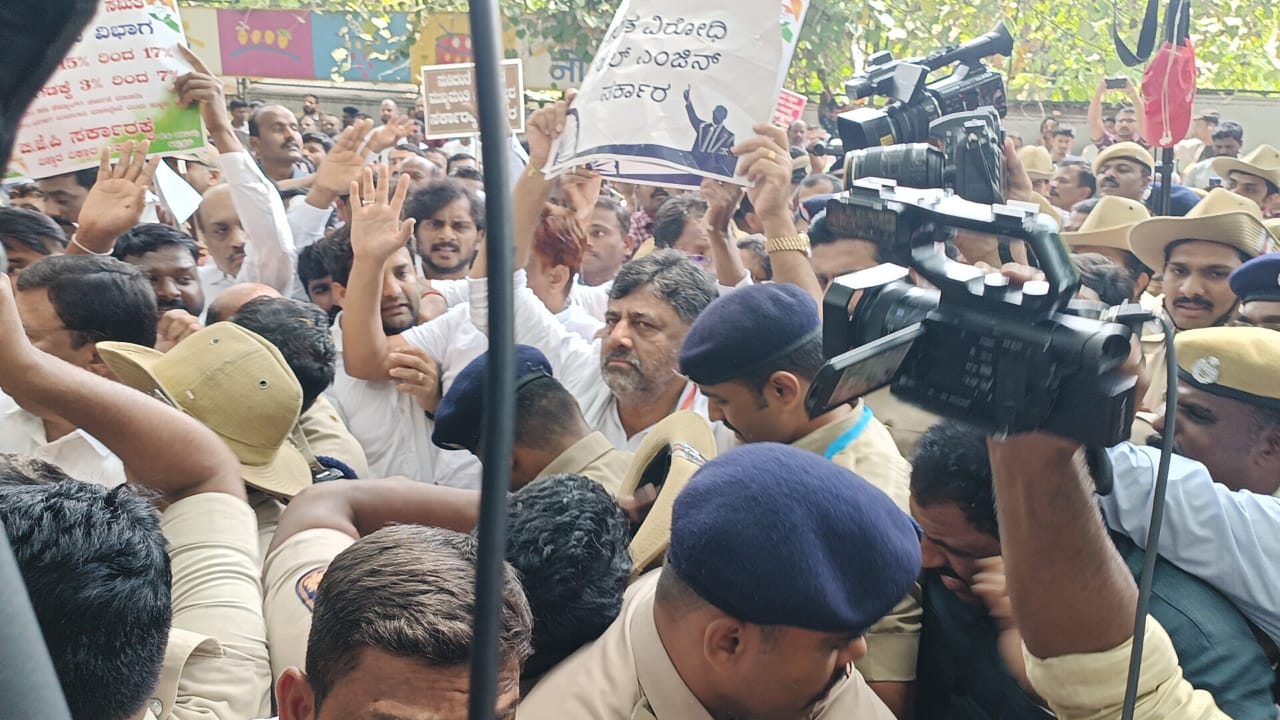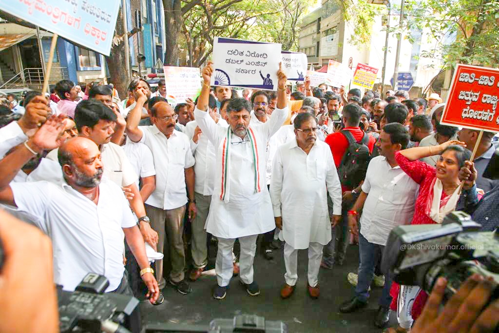 ಶುಕ್ರವಾರ ಇಲ್ಲಿನ ಕ್ವೀನ್ಸ್ ರಸ್ತೆಯಿಂದ ರಾಜಭವನವರೆಗೂ ಕಾಲ್ನಾಡಿಗೆ ಮೂಲಕ ಪ್ರತಿಭಟನಾ ಮೆರವಣಿಗೆ ನಡೆಸಿದ ಕಾಂಗ್ರೆಸ್ ನಾಯಕರು, ಎಸ್ಸಿ, ಎಸ್ಟಿ ಮೀಸಲಾತಿ ಸಂಬಂಧಶೆಡ್ಯೂಲ್ 9ಕ್ಕೆಸೇರ್ಪಡೆಗೊಳಿಸಲು ಕೋರಿ ಕೇಂದ್ರ ಸರಕಾರಕ್ಕೆ ವಿಳಂಬವಾಗಿ ಶಿಫಾರಸು ಮಾಡಿರುವ ವಿರುದ್ಧ ಆಕ್ರೋಶ ಹೊರಹಾಕಿ, ರಾಜಭವನ ಮುತ್ತಿಗೆ ಹಾಕಲು ಯತ್ನಿಸಿದರು. ಈ ವೇಳೆವಿಧಾನಸಭೆಯ ಪ್ರತಿಪಕ್ಷ ನಾಯಕ ಸಿದ್ದರಾಮಯ್ಯ, ಕೆಪಿಸಿಸಿ ಅಧ್ಯಕ್ಷ ಡಿ.ಕೆ.ಶಿವಕುಮಾರ್, ಮೇಲ್ಮನೆ ಪ್ರತಿಪಕ್ಷ ನಾಯಕ ಬಿ.ಕೆ.ಹರಿಪ್ರಸಾದ್, ಕಾರ್ಯಾಧ್ಯಕ್ಷರಾದ ರಾಮಲಿಂಗಾ ರೆಡ್ಡಿ, ಸಲೀಂ ಅಹ್ಮದ್, ಡಾ.ಜಿ.ಪರಮೇಶ್ವರ್ ಸೇರಿದಂತೆ ಹಲವರನ್ನು ಪೊಲೀಸರು ವಶಕ್ಕೆ ಪಡೆದು ವಾಹನದಲ್ಲಿ ಕರೆದೊಯ್ದರು.