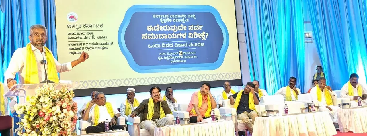 ಅವರಿಂದು ನಗರದ ಕೃಷಿ ವಿಶ್ವ ವಿದ್ಯಾಲಯದ ಜಗಜ್ಯೋತಿ ಬಸವೇಶ್ವರ ಸಭಾಂಗಣದಲ್ಲಿ ಜಾಗೃತ ಕರ್ನಾಟಕ, ರಾಯಚೂರು ಜಿಲ್ಲಾ ಹಿಂದುಳಿದ ವರ್ಗಗಳ ಒಕ್ಕೂಟ ಹಾಗೂ ಕರ್ನಾಟಕ ಸರ್ವ ಸಮುದಾಯಗಳ ಸಾಮಾಜಿಕ ನ್ಯಾಯ ಸಂರಕ್ಷಣಾ ಅಭಿಯಾನ ನೇತೃತ್ವದಲ್ಲಿ ಆಯೋಜಿಸಿದ ಕರ್ನಾಟಕ ಸಾಮಾಜಿಕ ಮತ್ತು ಶೈಕ್ಷಣಿಕ ಸಮೀಕ್ಷೆ-2 ಒಂದು ದಿನದ ವಿಚಾರ ಸಂಕಿರಣ ಕಾರ್ಯಕ್ರಮದಲ್ಲಿ ಡಾ.ಅಂಬೇಡ್ಕರ್ ಮತ್ತು ದಿ.ದೇವರಾಜ ಅರಸು ಅವರ ಭಾವಚಿತ್ರಕ್ಕೆ ಪುಷ್ಪ ನಮನ ಸಲ್ಲಿಸಿ ಕಾರ್ಯಕ್ರಮ ಉದ್ಘಾಟಿಸಿ ಮಾತನಾಡಿದರು.