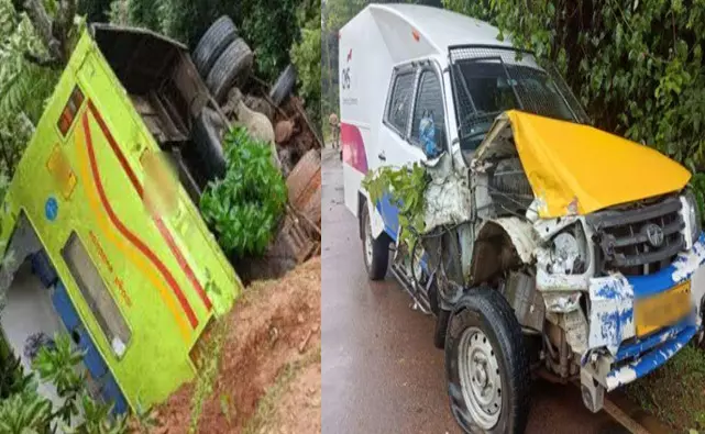 ಬೆಂಗಳೂರು ನಿಂದ ಭಟ್ಕಳ ಕಡೆ ಸಾಗುತ್ತಿದ್ದ ಬಸ್, ನಿಟ್ಟೂರು ಬ್ಯಾಂಕಿಗೆ ಹಣ ಹಾಕಿ ಬರುತ್ತಿದ್ದ ಬ್ಯಾಂಕ್ ಸಿಎಂಎಸ್ ವಾಹನದ ನಡುವೆ ಬಪ್ಪನಮನೆ ಸಮಗೋಡು ನಡುವಿನ ಗಾಜನೂರು ಕ್ರಾಸ್ ನಲ್ಲಿ ಅಪಘಾತ ಸಂಭವಿಸಿದೆ. ಚಾಲಕನ ನಿಯಂತ್ರಣ ತಪ್ಪಿ ಬಸ್ ಹೆದ್ದಾರಿ ಪಕ್ಕಕ್ಕೆ ಉರುಳಿದೆ. ಬಸ್ಸಿನಲ್ಲಿ 50ಕ್ಕೂ ಹೆಚ್ಚು ಪ್ರಯಾಣಿಕರಿದ್ದು, ಹಲವರಿಗೆ ಸಣ್ಣಪುಟ್ಟ ಗಾಯಗಳಾಗಿವೆ. ಗಾಯಾಳುಗಳನ್ನು ಕೂಡಲೇ ನಗರದ ಸರಕಾರಿ ಆಸ್ಪತ್ರೆಗೆ ಸಾಗಿಸಿ ಚಿಕಿತ್ಸೆ ನೀಡಲಾಯಿತು ಎಂದು ತಿಳಿದು ಬಂದಿದೆ.