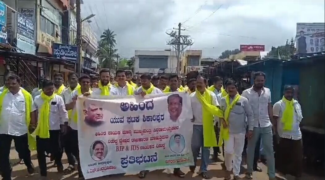 ಅಂಗಡಿ ಮುಗ್ಗಟ್ಟುಗಳು ಬಂದ್ ಆಗಿದ್ದು, ಶಿಕಾರಿಪುರ ಪಟ್ಟಣದಲ್ಲಿ ಅಹಿಂದ ಸಂಘಟನೆ ಆಶ್ರಯದಲ್ಲಿ ಮುಖಂಡರು ಪ್ರತಿಭಟನೆ ನಡೆಸಿದರು.