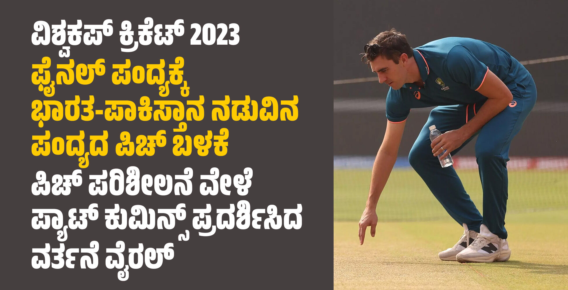 ಪಂದ್ಯದ ಆರಂಭಕ್ಕೂ ಮುನ್ನಾ ದಿನ ಉಭಯ ತಂಡಗಳ ನಾಯಕರು ಪಿಚ್ ಪರಿಶೀಲನೆ ನಡೆಸುವುದು ವಾಡಿಕೆಯ ಸಂಗತಿ. ಆದರೆ, ಪಿಚ್ ಕುರಿತು ಡ್ರೆಸಿಂಗ್ ರೂಂನಲ್ಲಿ ಕಾರ್ಯತಂತ್ರ ರೂಪಿಸಲು ಪಿಚ್ ನ ಫೊಟೋ ತೆಗೆದುಕೊಳ್ಳುವುದು ಕೊಂಚ ಅಸಹಜ ಸಂಗತಿಯೇ ಆಗಿದೆ. ರವಿವಾರ ಭಾರತ ಮತ್ತು ಆಸ್ಟ್ರೇಲಿಯಾ ತಂಡಗಳ ನಡುವೆ ನಡೆಯಲಿರುವ ವಿಶ್ವಕಪ್ ಫೈನಲ್ ಪಂದ್ಯಕ್ಕೂ ಮುನ್ನ 22 ವರ್ಷದಷ್ಟು ಹಳೆಯದಾದ ಪಿಚ್ ಪರಿಶೀಲನೆಗೆ ತೆರಳಿದ್ದ ಆಸ್ಟ್ರೇಲಿಯಾ ತಂಡದ ನಾಯಕ ಪ್ಯಾಟ್ ಕುಮಿನ್ಸ್ ಖಚಿತವಾಗಿ ಮಾಡಿದ್ದು ಅದನ್ನೆ. ಈ ದೊಡ್ಡ ಪಂದ್ಯಕ್ಕೂ ಮುನ್ನ ಆಸ್ಟ್ರೇಲಿಯಾ ತಂಡವು ಪಿಚ್ ಬಗ್ಗೆ ಹೆಚ್ಚು ತಲೆ ಕೆಡಿಸಿಕೊಂಡಿರುವಂತೆ ಕಾಣುತ್ತಿದೆ. ಈಗಾಗಲೇ ಭಾರತ ಮತ್ತು ಪಾಕಿಸ್ತಾನ ತಂಡದ ನಡುವಿನ ಪಂದ್ಯಕ್ಕೆ ಬಳಕೆಯಾಗಿರುವ ಪಿಚ್ ಅನ್ನು ಫೈನಲ್ ಪಂದ್ಯಕ್ಕೂ ಬಳಸುತ್ತಿರುವ ಕುರಿತು ಪ್ಯಾಟ್ ಕುಮಿನ್ಸ್ ರನ್ನು ಪ್ರಶ್ನಿಸಿದಾಗ, ಅವರು ರಕ್ಷಣಾತ್ಮಕ ಉತ್ತರದ ಮೊರೆ ಹೋದರು.