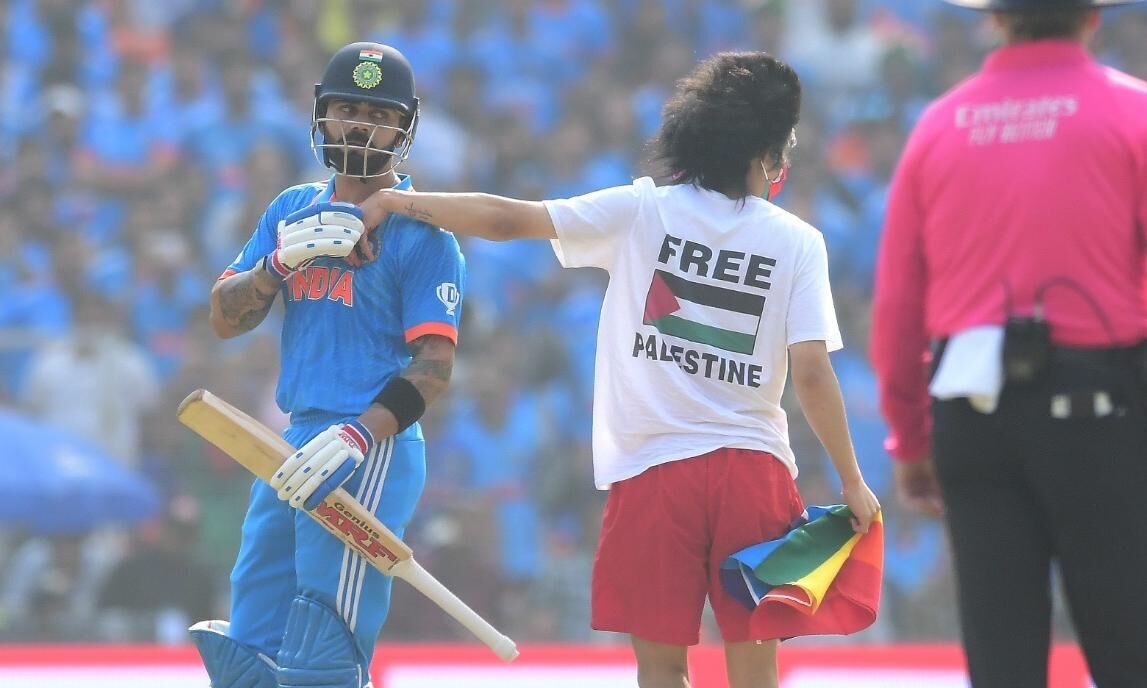 ʼಫ್ರೀ ಫೆಲೆಸ್ತೀನ್ʼ ಟಿ - ಶರ್ಟ್ ತೊಟ್ಟು ಪಿಚ್ಗೆ ನುಗ್ಗಿ, ಕೊಹ್ಲಿಯನ್ನು ತಬ್ಬಿಕೊಂಡ ಅಭಿಮಾನಿ