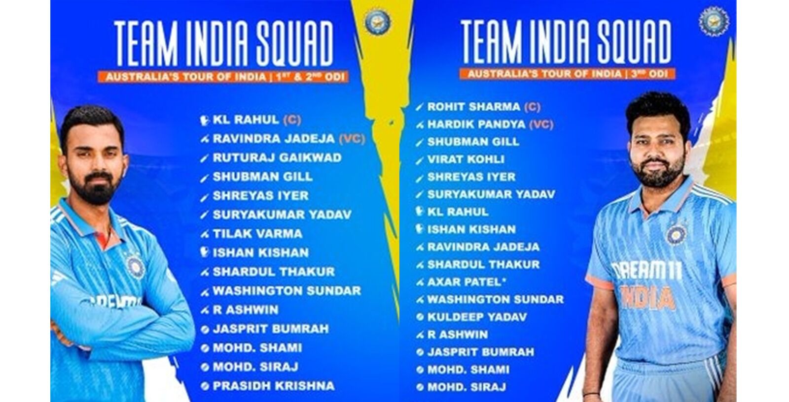 ಕೆ.ಎಲ್ ರಾಹುಲ್ (ನಾಯಕ), ರವೀಂದ್ರ ಜಡೇಜ (ಉಪನಾಯಕ), ಋತುರಾಜ್ ಗಾಯಕವಾಡ್, ಶುಭಮನ್ ಗಿಲ್, ಶ್ರೇಯಸ್ ಅಯ್ಯರ್, ಸೂರ್ಯಕುಮಾರ್ ಯಾದವ್, ತಿಲಕ್ ವರ್ಮಾ, ಇಶಾನ್ ಕಿಶನ್ (ವಿಕೆಟ್ ಕೀಪರ್), ಶಾರ್ದೂಲ್ ಠಾಕೂರ್, ವಾಷಿಂಗ್ಟನ್ ಸುಂದರ್, ಆರ್. ಅಶ್ವಿನ್, ಜಸ್ಪ್ರೀತ್ ಬೂಮ್ರಾ, ಮೊಹಮ್ಮದ್ ಶಮಿ, ಮೊಹಮ್ಮದ್ ಸಿರಾಜ್, ಪ್ರಸಿದ್ದ ಕೃಷ್ಣ.