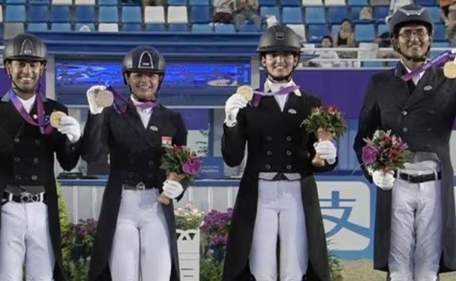 ಬೀಜಿಂಗ್/ಹೊಸದಿಲ್ಲಿ: ಚೀನಾದ ಹ್ಯಾಂಗ್ ಝೂನಲ್ಲಿ ನಡೆಯುತ್ತಿರುವ ಏಶ್ಯನ್ ಗೇಮ್ಸ್ ಕ್ರೀಡಾಕೂಟದಲ್ಲಿ 41 ವರ್ಷಗಳಲ್ಲಿ ಇದೇ ಮೊದಲ ಬಾರಿಗೆ ಭಾರತದ ತಂಡ ಕುದುರೆ ಸವಾರಿ (ಡೆಸ್ಸೇಜ್ ಟೀಮ್ ಇವೆಂಟ್) ಸ್ಪರ್ಧೆಯಲ್ಲಿ ಚಿನ್ನದ ಪದಕ ಗೆದ್ದುಕೊಂಡಿದೆ.