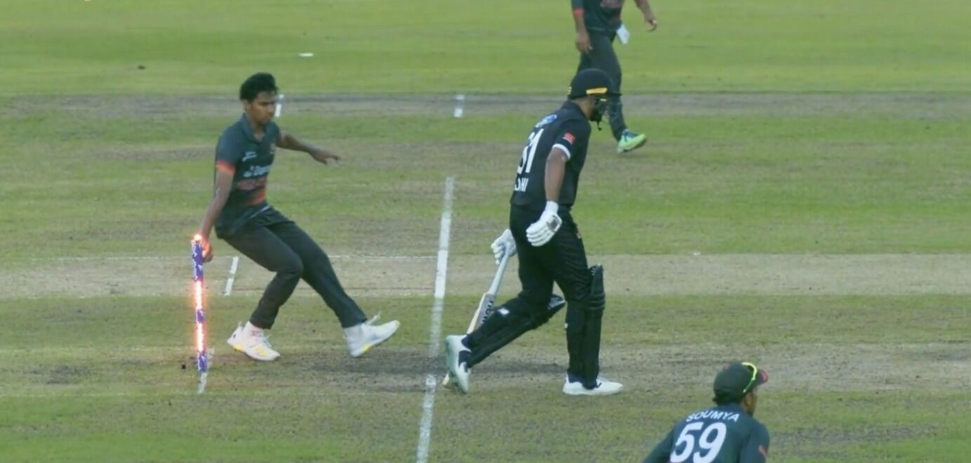 ಕಿವೀಸ್ ಇನ್ನಿಂಗ್ಸ್ನ 46ನೇ ಓವರ್ನಲ್ಲಿ ಈ ಸನ್ನಿವೇಶಕ್ಕೆ ವೇದಿಕೆಯಾಯಿತು. ಚೆಂಡು ಎಸೆಯುವ ಮುನ್ನವೇ ಸೋಧಿ ನಾನ್ಸ್ಟ್ರೈಕ್ ಬಿಟ್ಟಿದ್ದನ್ನು ಗಮನಿಸಿದ ಹಸನ್, ಬೌಲಿಂಗ್ ಮಾಡುವುದರ ಬದಲಿಗೆ ಸ್ಟಂಪ್ಸ್ಗೆ ಚೆಂಡು ಮುಟ್ಟಿಸಿ ಬೇಲ್ಸ್ ಹಾರಿಸಿದರು. ಈ ವೇಳೆ ಅಂಪೈರ್ ಮಾರೈಸ್ ಎರಾಸ್ಮಸ್, ಮೂರನೇ ಅಂಪೈರ್ಗೆ ಮೇಲ್ಮನವಿ ಸಲ್ಲಿಸಿದರು. ಬ್ಯಾಟರ್ ಸೋಧಿ ಕ್ರೀಸ್ನಿಂದ ಹೊರಗಿದ್ದ ಕಾರಣ, ಖಚಿತವಾಗಿ ಸೋಧಿ ಅವರನ್ನು ಔಟ್ ಎಂದು ಘೋಷಿಸಿದರು.