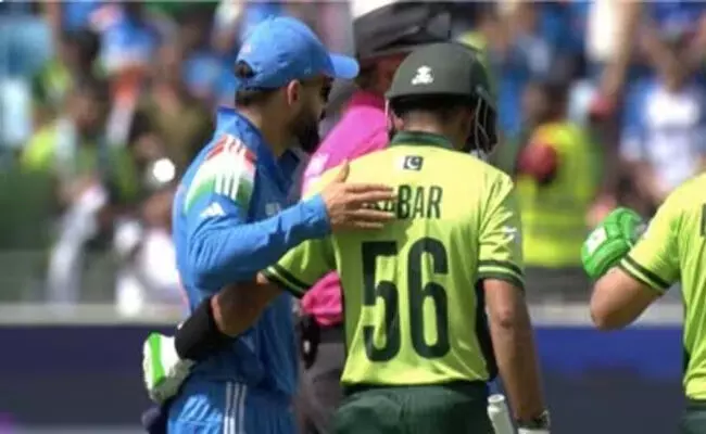 ಇಮಾಮ್ವುಲ್ ಹಕ್ರೊಂದಿಗೆ ಇನಿಂಗ್ಸ್ ಆರಂಭಿಸಲು ಮೈದಾನಕ್ಕೆ ಇಳಿದ ಬಾಬರ್ ಆಝಮ್ರನ್ನು ಕೊಹ್ಲಿ ಆತ್ಮೀಯ ಅಪ್ಪುಗೆಯೊಂದಿಗೆ ಸ್ವಾಗತಿಸಿದರು. ಇಬ್ಬರು ಬ್ಯಾಟಿಂಗ್ ಐಕಾನ್ಗಳ ನಡುವಿನ ಕ್ರೀಡಾ ಮನೋಭಾವದ ನಡವಳಿಕೆಯು ಸಾಮಾಜಿಕ ಜಾಲತಾಣದಲ್ಲಿ ತಕ್ಷಣವೇ ವೈರಲ್ ಆಗಿ ವಿಶ್ವದಾದ್ಯಂತ ಕ್ರಿಕೆಟ್ ಅಭಿಮಾನಿಗಳ ಭಾವನೆಗಳನ್ನು ಸೆಳೆಯಿತು.