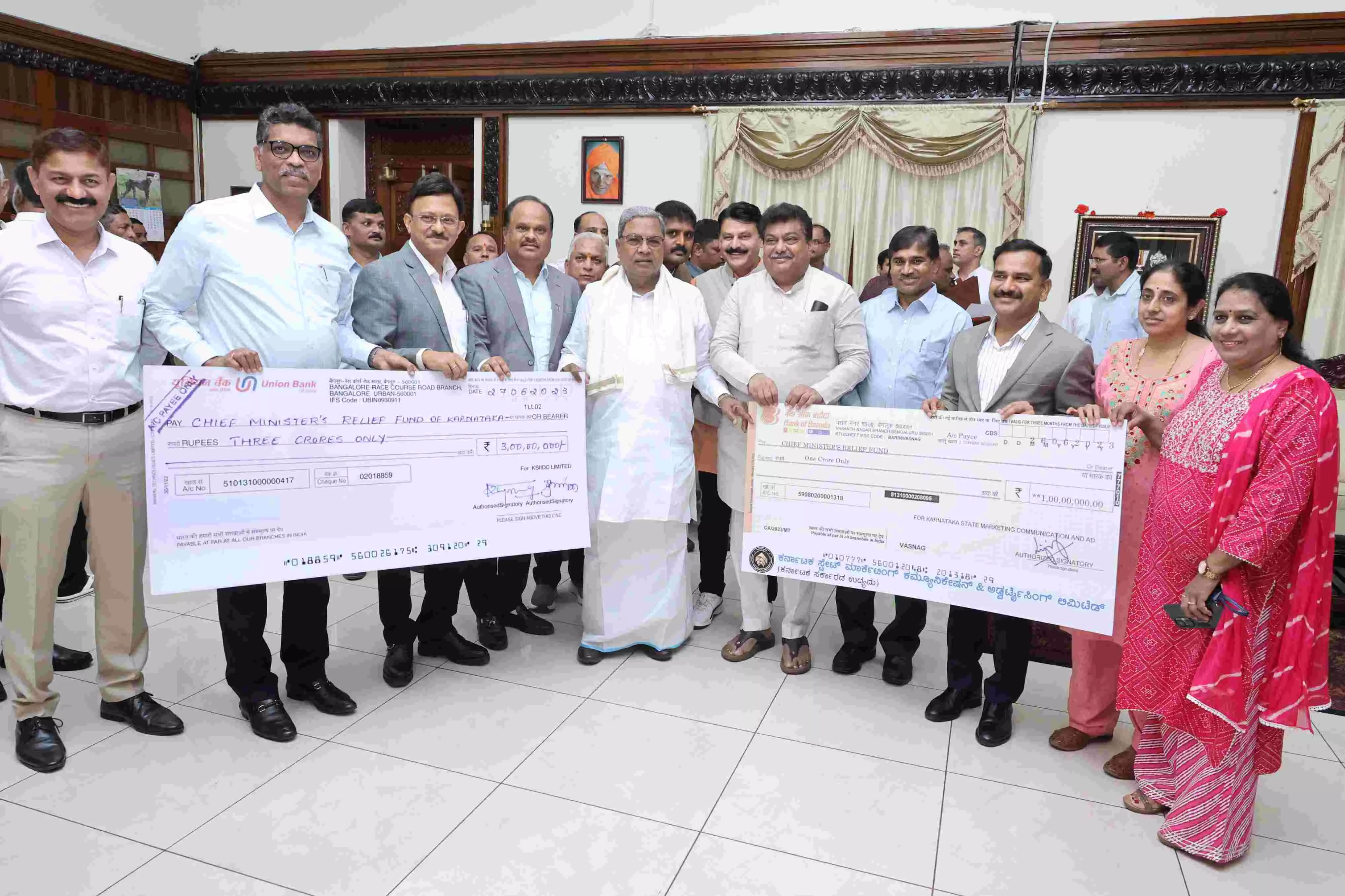 ಬೆಂಗಳೂರು: ಕರ್ನಾಟಕ ಕೈಗಾರಿಕಾ ಮೂಲಸೌಲಭ್ಯ ಅಭಿವೃದ್ಧಿ ನಿಗಮದ ವತಿಯಿಂದ 3 ಕೋಟಿ ರೂ. ಮತ್ತು ಕರ್ನಾಟಕ ರಾಜ್ಯ ಮಾರುಕಟ್ಟೆ ಸಂವಹನ ಹಾಗೂ ಜಾಹೀರಾತು ಸಂಸ್ಥೆ (ಎಂಸಿಎ) ವತಿಯಿಂದ 1 ಕೋಟಿ ರೂ.ಗಳ ಚೆಕ್ ಅನ್ನು 'ಮುಖ್ಯಮಂತ್ರಿಗಳ ಪರಿಹಾರ ನಿಧಿ'ಗೆ ಗುರುವಾರ ನೀಡಲಾಯಿತು.