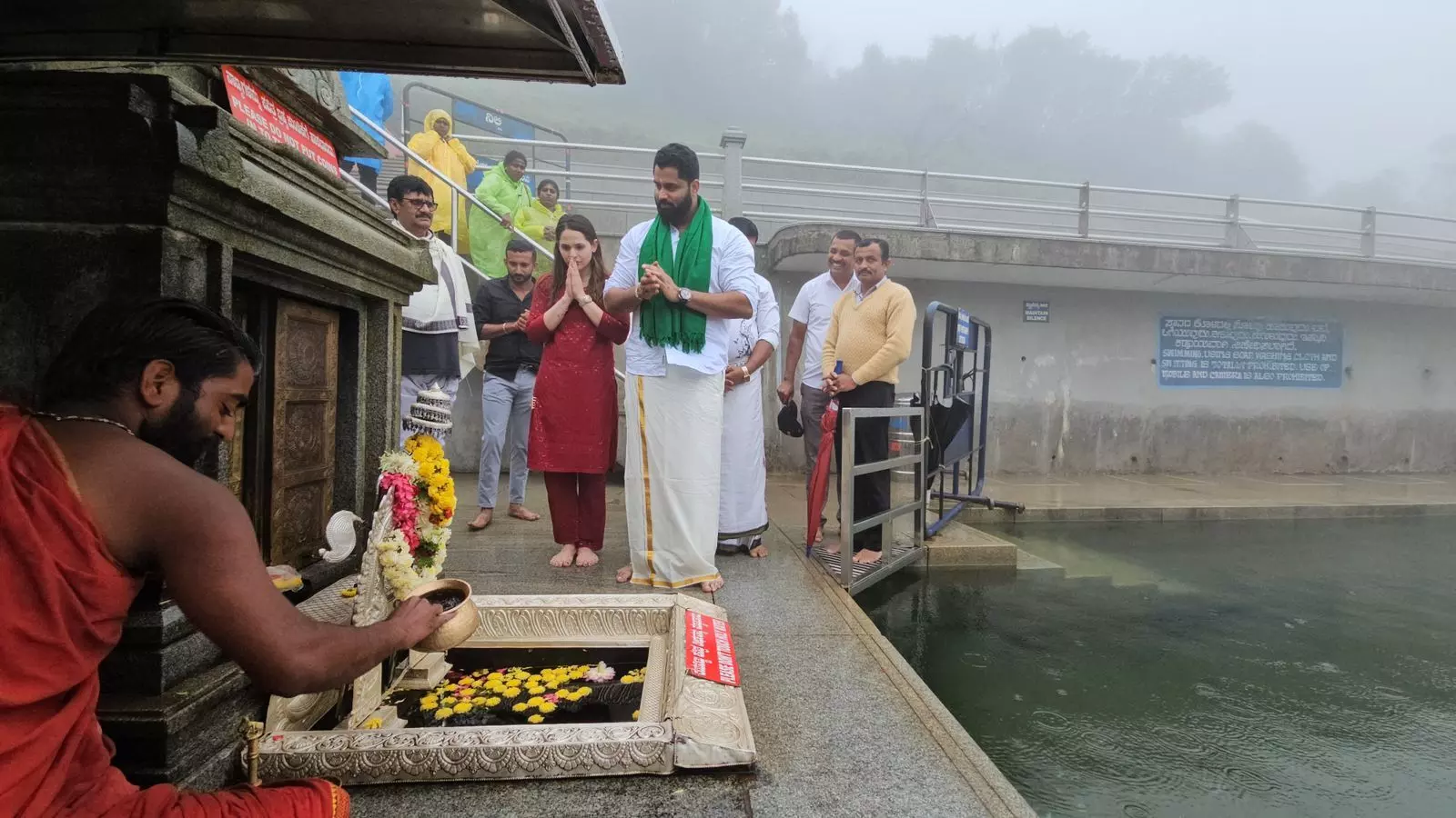 ಮಡಿಕೇರಿ ಸೆ.30 : ನಟ ಅಭಿಷೇಕ್ ಅಂಬರೀಷ್ ತಮ್ಮ ಪತ್ನಿ ಅವಿವಾ ಜೊತೆ ಕಾವೇರಿ ಉಗಮಸ್ಥಾನ ತಲಕಾವೇರಿಗೆ ಭೇಟಿ ನೀಡಿ ಕಾವೇರಿ ಮಾತೆಗೆ ವಿಶೇಷ ಪೂಜೆ ಸಲ್ಲಿಸಿದರು.ಕಾವೇರಿ ನದಿ ಪಾತ್ರದಲ್ಲಿ ಮಳೆಯಾಗಿ ಕಾವೇರಿ ವಿವಾದ ಬಗೆಹರಿಯಲೆಂದು ಪ್ರಾರ್ಥನೆ ಸಲ್ಲಿಸಿದರು.