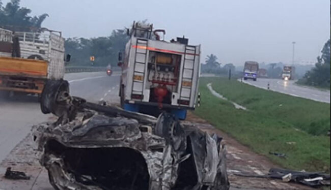 ಒಂದೇ ಕುಟುಂಬದ ನಾಲ್ವರು ಕಾರಿನಲ್ಲಿ ಇಂದು ಬೆಳಗಿನ ಜಾವ ನಾಲ್ಕು ಗಂಟೆ ಸುಮಾರಿಗೆ ಮೈಸೂರು ರಸ್ತೆ ಕಡೆಯಿಂದ ಕನಕಪುರ ರಸ್ತೆ ಕಡೆಗೆ ತೆರಳುತಿದ್ದ ವೇಳೆ ಕಾರು ಲಾರಿಗೆ ಢಿಕ್ಕಿ ಹೊಡೆದಿದೆ. ಘಟನೆಯ ಪರಿಣಾಮ ಕಾರಿಗೆ ಬೆಂಕಿ ಹೊತ್ತಿಕೊಂಡಿದ್ದು, ಸಂಪೂರ್ಣ ಸುಟ್ಟು ಕರಕಲಾಗಿದೆ.