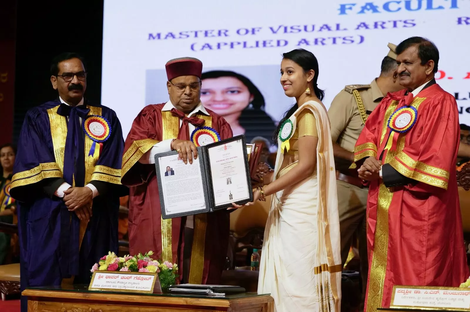 ಸೋಮವಾರ ವಿವಿಯ ಜ್ಞಾನಜ್ಯೋತಿ ಸಂಭಾಗಣದಲ್ಲಿ ನಡೆದ ಘಟಿಕೋತ್ಸವದಲ್ಲಿ ರಾಜ್ಯಪಾಲರಿಂದ ಅವನಿ ಶರ್ಮಾ ಚಿನ್ನದ ಪದಕ ಸ್ವೀಕರಿಸಿದರು.