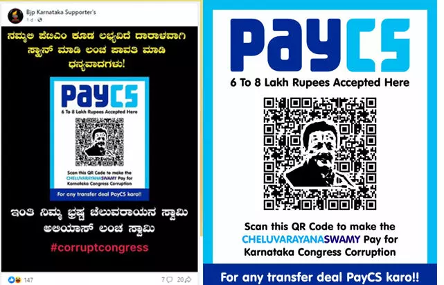 ಬಿಜೆಪಿ ಕರ್ನಾಟಕ ಸಪೋರ್ಟರ್ಸ್ ಎಂಬ ಫೇಸ್ ಬುಕ್ ಪೇಜ್ ನಲ್ಲಿ ಈ ಹಿಂದೆ ಕಾಂಗ್ರೆಸ್ ಮಾಡಿದಂತೆಯೇ ‘ಪೇ ಸಿಎಸ್’ ಎಂಬ ಕ್ಯೂ ಆರ್ ಕೋಡ್ ಪೋಸ್ಟರ್ ಕಾಣಿಸಿಕೊಂಡಿದೆ. “ನಮ್ಮಲ್ಲಿ ಪೇಟಿಎಂ ಕೂಡ ಲಭ್ಯವಿದೆ. ಸ್ಕ್ಯಾನ್ ಮಾಡಿ ಧಾರಾಳವಾಗಿ ಲಂಚ ಪಾವತಿ ಮಾಡಿ, ಧನ್ಯವಾದಗಳು. ಇಂತಿ ನಿಮ್ಮ ಭ್ರಷ್ಟ ಚೆಲುವರಾಯನ ಸ್ವಾಮಿ ಅಲಿಯಾಸ್ ಲಂಚ ಸ್ವಾಮಿ. #corruptcongress” ಎಂದು ಪೋಸ್ಟರ್ ನಲ್ಲಿ ಬರೆಯಲಾಗಿದೆ.