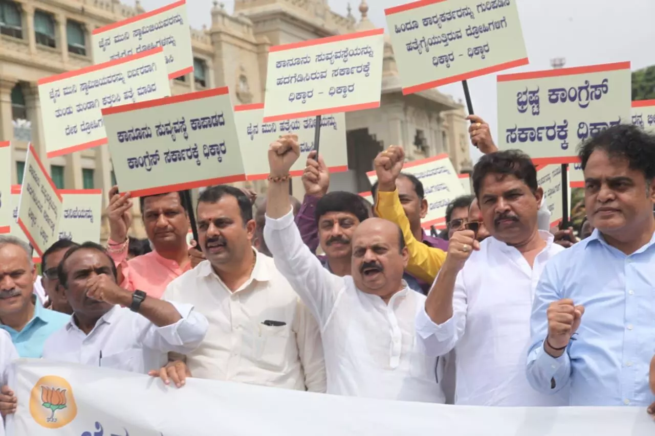 ಬೆಂಗಳೂರು: ರಾಜ್ಯದಲ್ಲಿ ಕಾನೂನು ಸುವ್ಯವಸ್ಥೆ ಹದಗೆಟ್ಟಿರುವುದನ್ನು ಖಂಡಿಸಿ ಮಾಜಿ ಮುಖ್ಯಮಂತ್ರಿ ಬಸವರಾಜ ಬೊಮ್ಮಾಯಿ ನೇತೃತ್ವದಲ್ಲಿ ಬಿಜೆಪಿ ಶಾಸಕರು ವಿಧಾನಸೌಧದ ಬಳಿ ಇರುವ ಗಾಂಧಿ ಪ್ರತಿಮೆ ಬಳಿ ಪ್ರತಿಭಟನೆ ನಡೆಸಿ, ರಾಜ್ಯ ಸರ್ಕಾರಕ್ಕೆ ಸೂಚನೆ ನೀಡುವಂತೆ ರಾಜ್ಯಪಾಲರಿಗೆ ಮನವಿ ಮಾಡಿದರು.