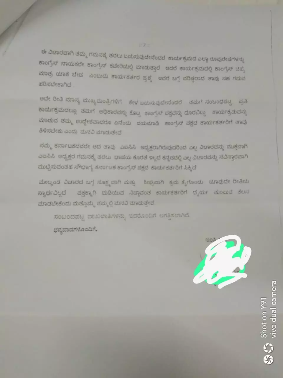 ಈ ವಿಚಾರವಾಗಿ ತಮ್ಮ ಗಮನಕ್ಕೆ ತರಲು ಬಯಸುವುದೇನೆಂದರೆ ಕಾರ್ಯಕ್ರಮದ ಎಲ್ಲಾ ರೂಪುರೇಷೆಗಳನ್ನು ಕಾಂಗ್ರೆಸ್ ನಾಯಕರೇ ಕಾಂಗ್ರೆಸ್ ಕಚೇರಿಯಲ್ಲಿ ಮಾಡುತ್ತಾರೆ. ಆದರೆ ಕಾರ್ಯಕ್ರಮದಲ್ಲಿ ಕಾಂಗ್ರೆಸ್ ಚಿಹ್ನೆ ಮಾತ್ರ ಯಾಕೆ ಬೇಡ ಎಂಬುದು ಕಾರ್ಯಕರ್ತರ ಪ್ರಶ್ನೆ. ಇದರ ಬಗ್ಗೆ ವರಿಷ್ಠರಾದ ತಾವು ಸಹ ಗಮನ ಹರಿಸಬೇಕಾಗಿದೆ.