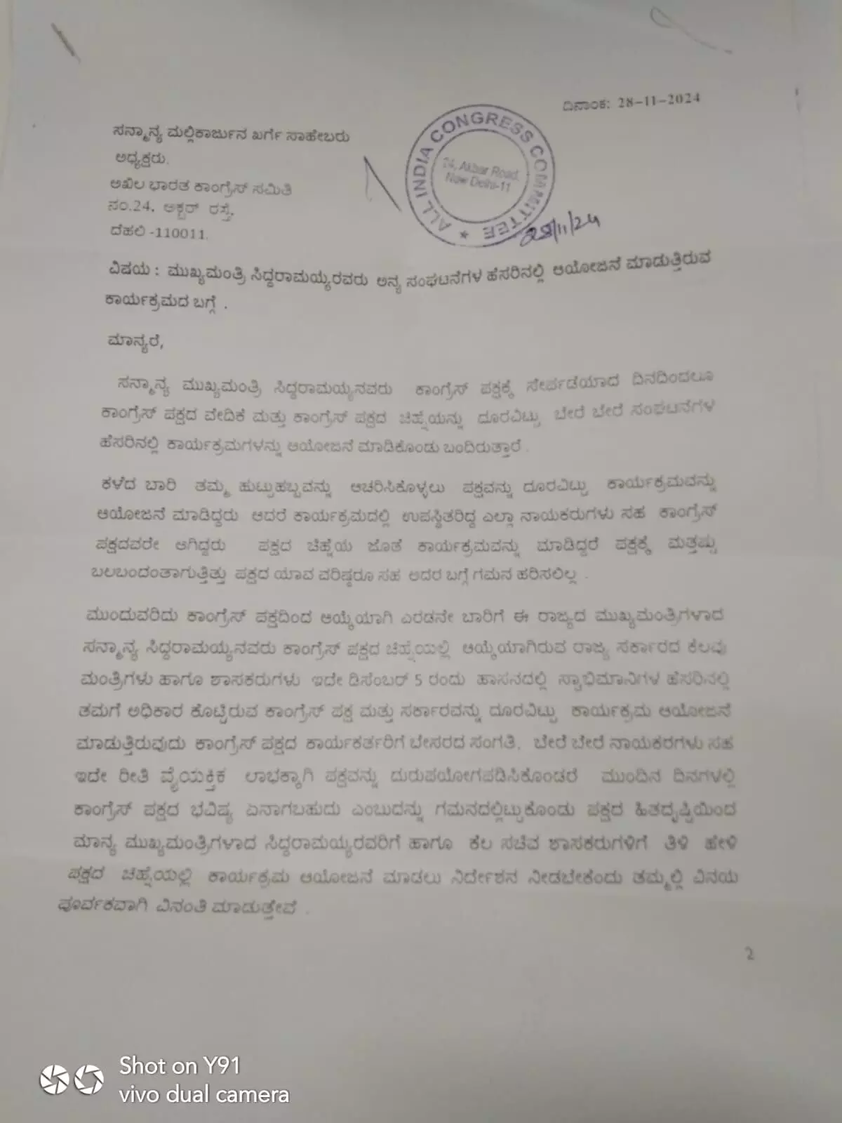 ಕಾಂಗ್ರೆಸ್ ಪಕ್ಷದಿಂದ ಆಯ್ಕೆಯಾಗಿ ಎರಡನೇ ಬಾರಿಗೆ ಈ ರಾಜ್ಯದ ಮುಖ್ಯಮಂತ್ರಿಗಳಾದ ಸಿದ್ದರಾಮಯ್ಯನವರು ಕಾಂಗ್ರೆಸ್ ಪಕ್ಷದ ಚಿಹ್ನೆಯಲ್ಲಿ ಆಯ್ಕೆಯಾಗಿರುವ ರಾಜ್ಯ ಸರಕಾರದ ಕೆಲವು ಮಂತ್ರಿಗಳು ಹಾಗೂ ಶಾಸಕರುಗಳು ಇದೇ ಡಿ.5 ರಂದು ಹಾಸನದಲ್ಲಿ ಸ್ವಾಭಿಮಾನಿಗಳ ಹೆಸರಿನಲ್ಲಿ ತಮಗೆ ಅಧಿಕಾರ ಕೊಟ್ಟಿರುವ ಕಾಂಗ್ರೆಸ್ ಪಕ್ಷ ಮತ್ತು ಸರಕಾರವನ್ನು ದೂರವಿಟ್ಟು ಕಾರ್ಯಕ್ರಮ ಆಯೋಜನೆ ಮಾಡುತ್ತಿರುವುದು ಕಾಂಗ್ರೆಸ್ ಪಕ್ಷದ ಕಾರ್ಯಕರ್ತರಿಗೆ ಬೇಸರದ ಸಂಗತಿ. ಬೇರೆ ಬೇರೆ ನಾಯಕರಗಳು ಸಹ ಇದೇ ರೀತಿ ವೈಯಕ್ತಿಕ ಲಾಭಕ್ಕಾಗಿ ಪಕ್ಷವನ್ನು ದುರುಪಯೋಗಪಡಿಸಿಕೊಂಡರೆ ಮುಂದಿನ ದಿನಗಳಲ್ಲಿ ಕಾಂಗ್ರೆಸ್ ಪಕ್ಷದ ಭವಿಷ್ಯ ಏನಾಗಬಹುದು ಎಂಬುದನ್ನು ಗಮನದಲ್ಲಿಟ್ಟುಕೊಂಡು ಪಕ್ಷದ ಹಿತದೃಷ್ಟಿಯಿಂದ ಮುಖ್ಯಮಂತ್ರಿಗಳಾದ ಸಿದ್ದರಾಮಯ್ಯರವರಿಗೆ ಹಾಗೂ ಕೆಲ ಸಚಿವ ಶಾಸಕರುಗಳಿಗೆ ತಿಳಿ ಹೇಳಿ ಪಕ್ಷದ ಚಿಹ್ನೆಯಲ್ಲಿ ಕಾರ್ಯಕ್ರಮ ಆಯೋಜನೆ ಮಾಡಲು ನಿರ್ದೇಶನ ನೀಡಬೇಕೆಂದು ತಮ್ಮಲ್ಲಿ ವಿನಯ ಪೂರ್ವಕವಾಗಿ ವಿನಂತಿ ಮಾಡುತ್ತೇವೆ.