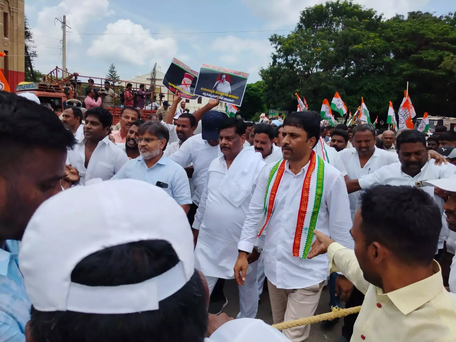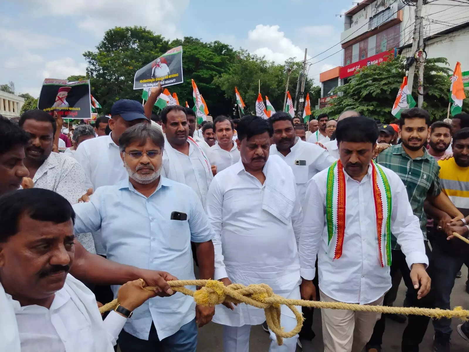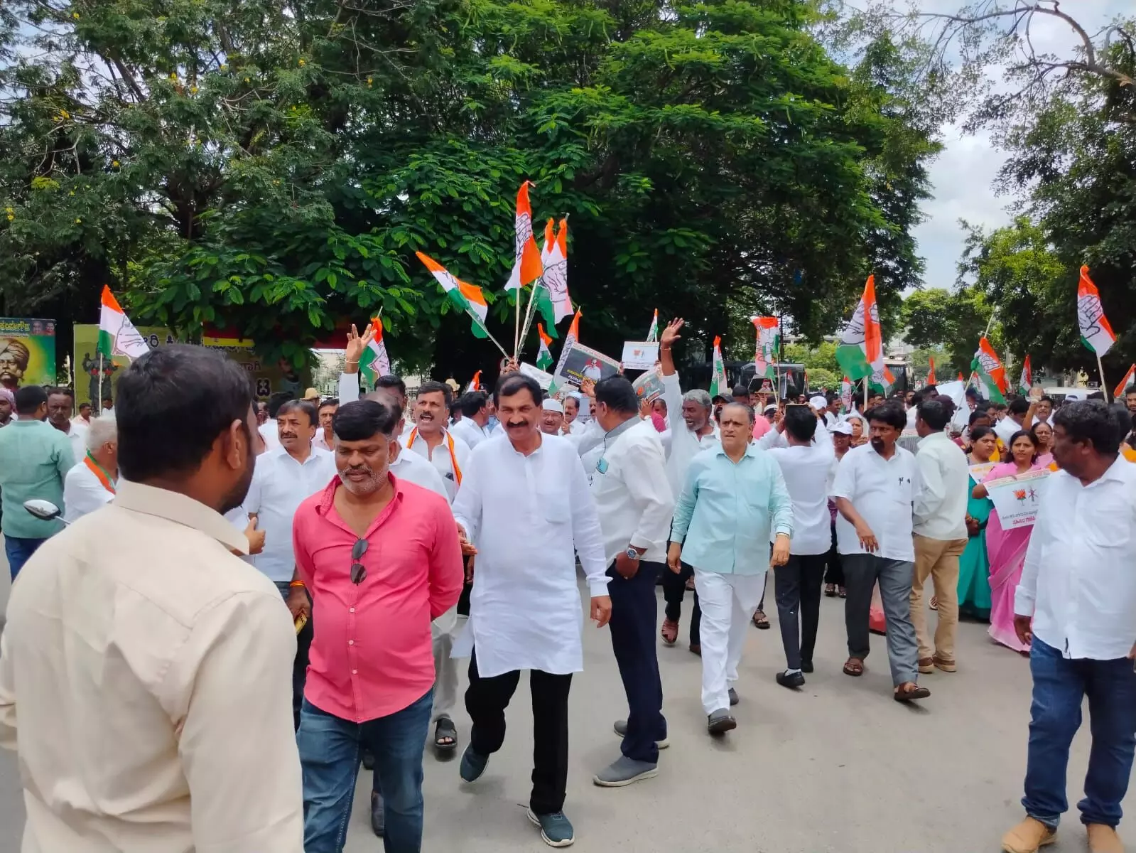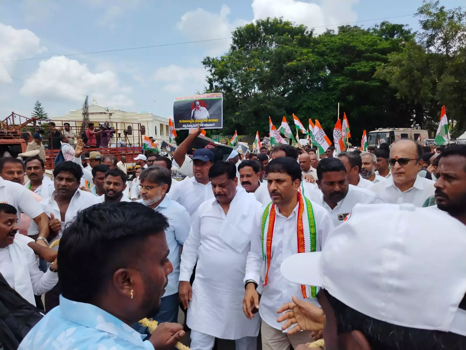 ನಗರದ ಗಾಂಧಿ ವೃತ್ತದಲ್ಲಿ ಸೋಮವಾರ ಜಮಾವಣೆಗೊಂಡ ಕಾಂಗ್ರೆಸ್ ಸಚಿವರು, ಶಾಸಕರುಗಳು, ಮುಖಂಡರು ಮತ್ತು ಕಾರ್ಯಕರ್ತರ್ತರು ರಾಜ್ಯಪಾಲ, ಬಿಜೆಪಿ-ಜೆಡಿಎಸ್ ಮತ್ತು ಕೇಂದ್ರ ಸರ್ಕಾರದ ವಿರುದ್ಧ ಘೋಷಣೆಗಳನ್ನು ಕೂಗಿ ಮುಖ್ಯಮಂತ್ರಿ ಸಿದ್ಧರಾಮಯ್ಯ ಅವರಿಗೆ ಬೆಂಬಲ ಸೂಚಿಸಿದರು.
