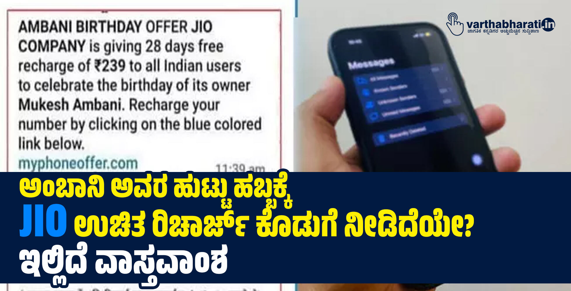 ಅಂಬಾನಿ ಅವರ ಹುಟ್ಟು ಹಬ್ಬಕ್ಕೆ Jio ಉಚಿತ ರಿಚಾರ್ಜ್ ಕೊಡುಗೆ ನೀಡಿದೆಯೇ?: ಇಲ್ಲಿದೆ ವಾಸ್ತವಾಂಶ