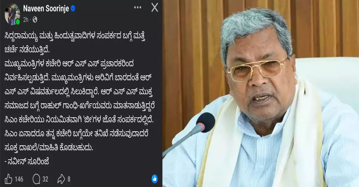 ಸಿಎಂ ಕಚೇರಿ ಆರೆಸ್ಸೆಸ್ ಪ್ರಚಾರಕರಿಂದ ನಿರ್ವಹಿಸಲ್ಪಡುತ್ತಿದೆ ಎಂದು ಆರೋಪಿಸಿದ ಪತ್ರಕರ್ತ ನವೀನ್ ಸೂರಿಂಜೆ