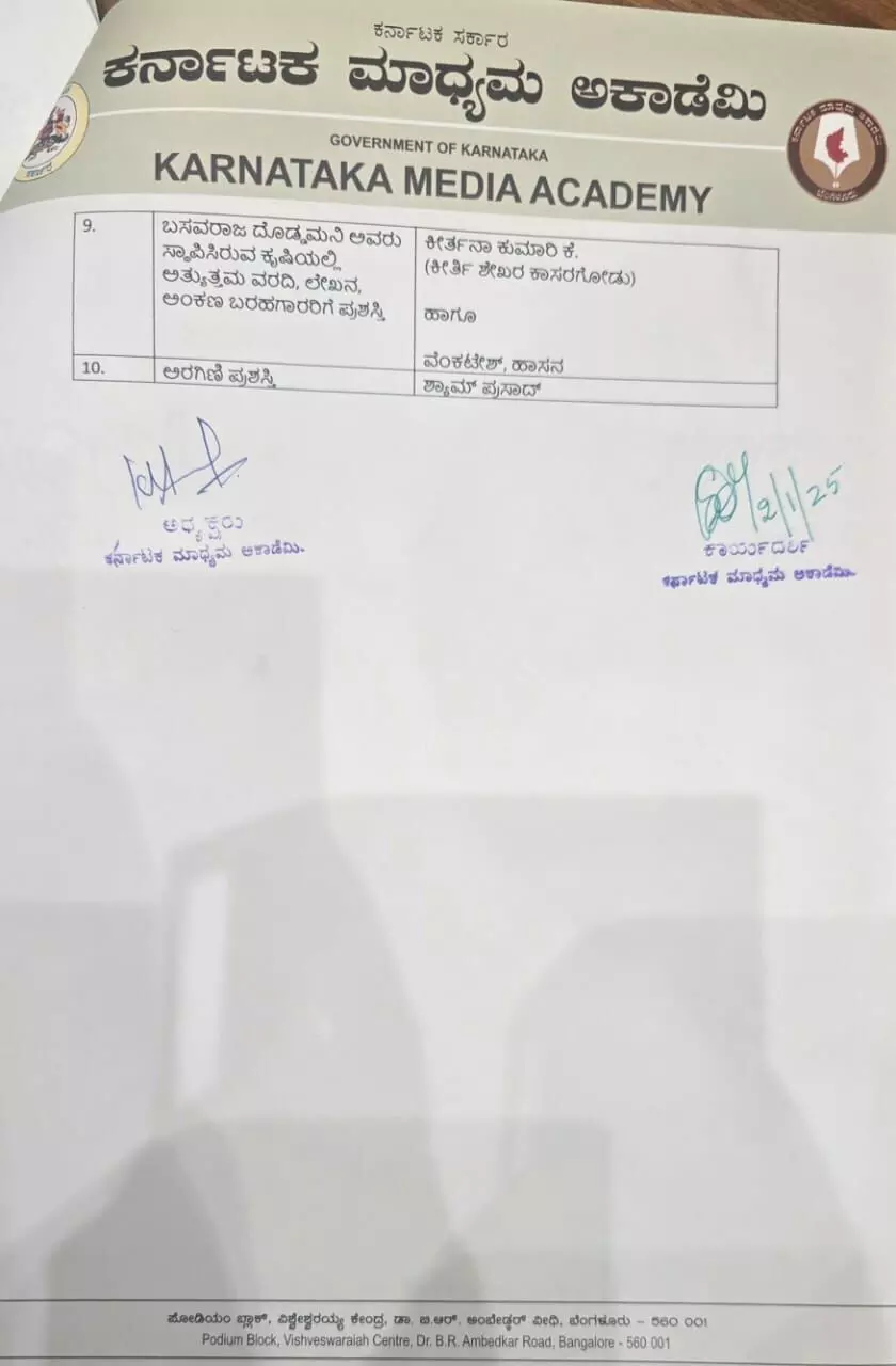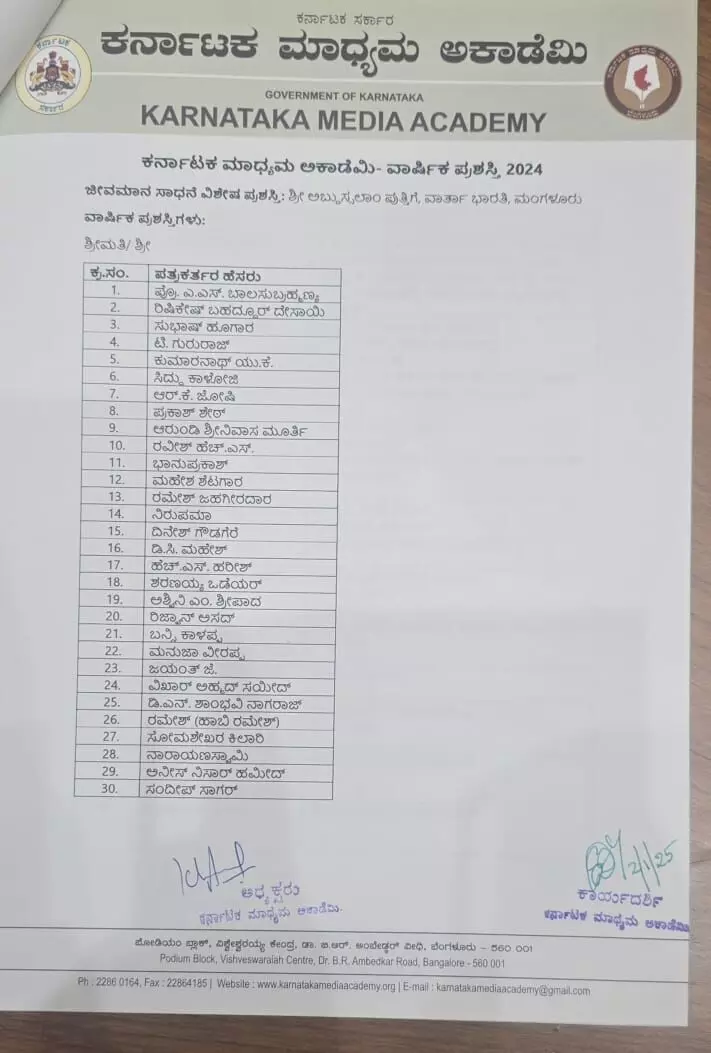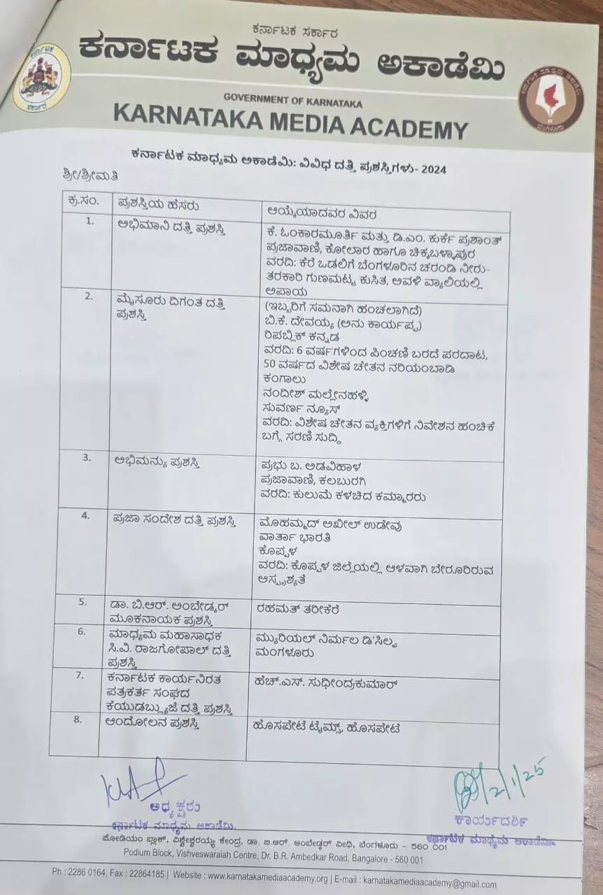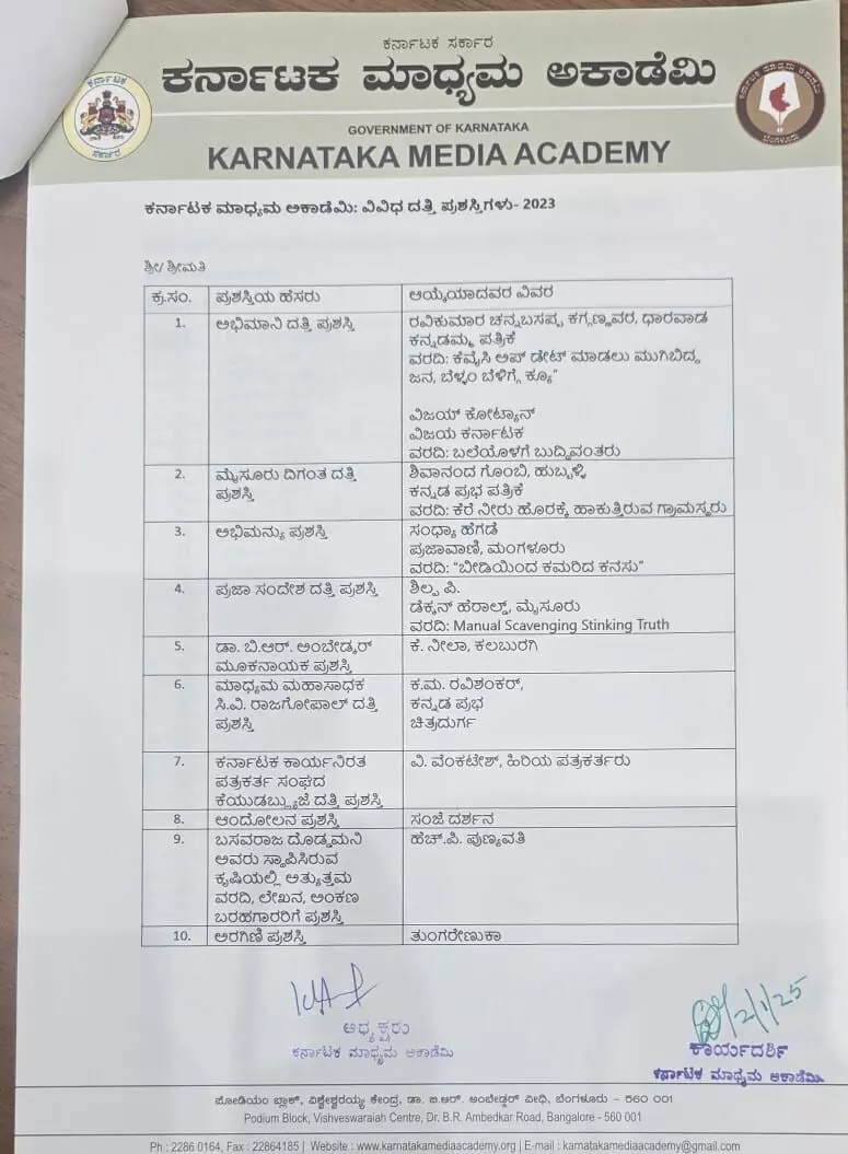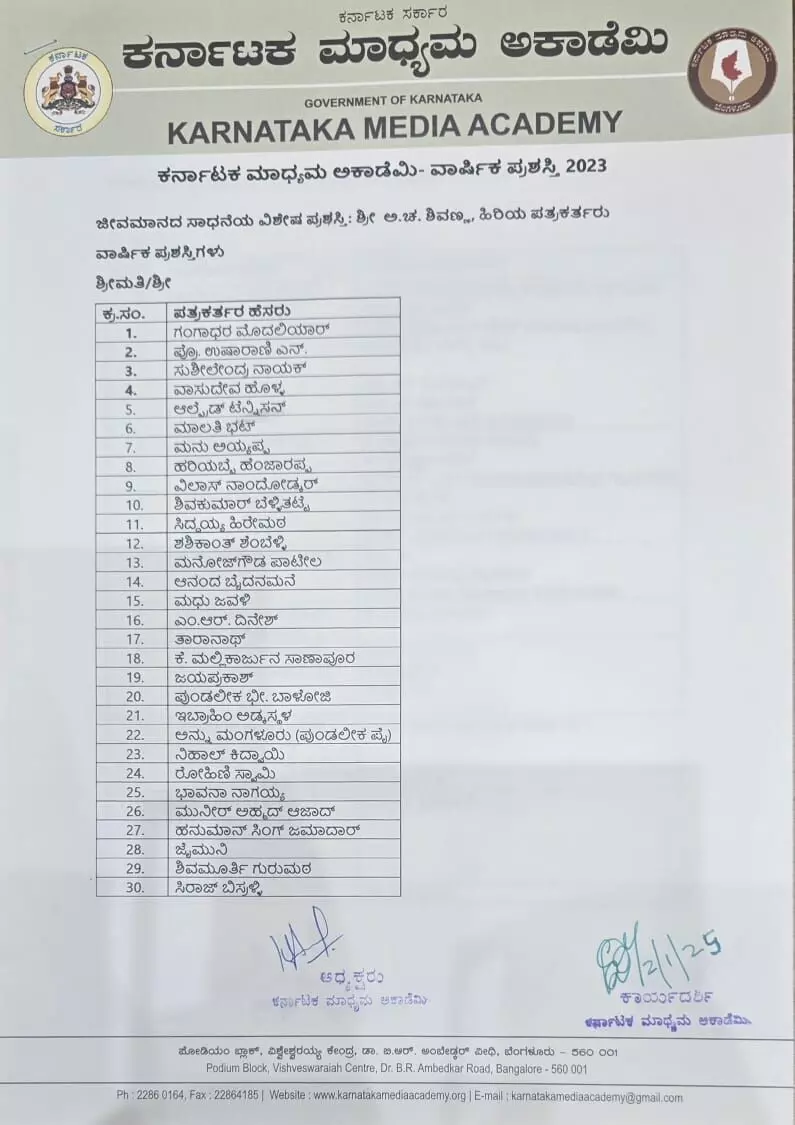 ಬೆಂಗಳೂರು : ರಾಜ್ಯ ಮಾಧ್ಯಮ ಅಕಾಡಮಿಯು 2023 ಹಾಗೂ 2024ನೇ ಸಾಲಿನ ಜೀವಮಾನದ ಸಾಧನೆಯ ವಿಶೇಷ ಪ್ರಶಸ್ತಿ, ವಾರ್ಷಿಕ ಪ್ರಶಸ್ತಿ ಹಾಗೂ ವಿವಿಧ ದತ್ತಿ ಪ್ರಶಸ್ತಿಗಳನ್ನು ಗುರುವಾರ ಪ್ರಕಟಿಸಿದೆ.