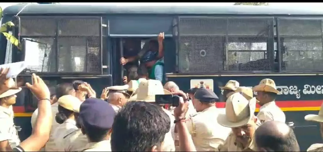 ಕರ್ನಾಟಕ ರಾಜ್ಯ ಕಬ್ಬು ಬೆಳೆಗಾರರ ಸಂಘದ ರಾಜ್ಯಾಧ್ಯಕ್ಷ ಕುರುಬೂರು ಶಾಂತಕುಮಾರ್ ನೇತೃತ್ವದಲ್ಲಿ ಮಂಗಳವಾರ ಮೈಸೂರು-ಬೆಂಗಳೂರು ರಾಷ್ಟ್ರೀಯ ಹೆದ್ದಾರಿಯ ಕೊಲಂಬಿಯ ಏಷಿಯಾ ಆಸ್ಪತ್ರೆ ಮುಂಭಾಗ ಹೆದ್ದಾರಿ ತಡೆಗೆ ಮುಂದಾದ ರೈತರನ್ನು ಮುನ್ನೆಚ್ವರಿಕೆ ಕ್ರಮವಾಗಿ ಬಂಧಿಸಿ ಸಿಎಆರ್ ಮೈದಾನಕ್ಕೆ ಕರೆದೊಯ್ಯಲಾಯಿತು.