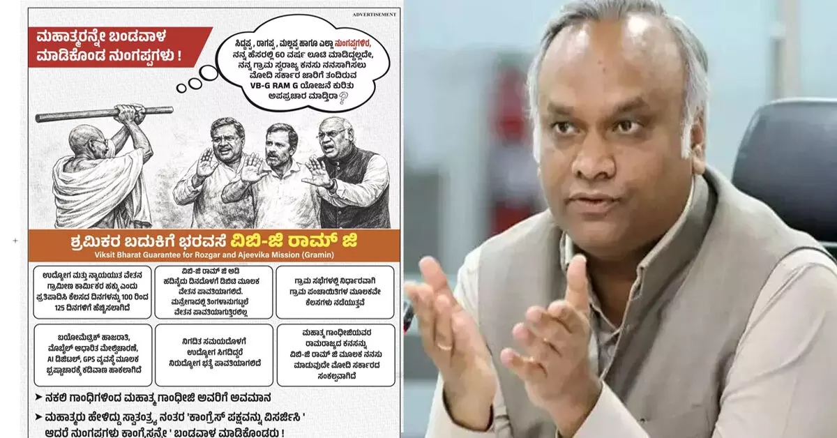 ಬೆಂಗಳೂರು : ʼಮಹಾತ್ಮನ ಮಹತ್ವ ಅರಿಯದ ಆರೆಸ್ಸೆಸ್ ಹಾಗೂ ಬಿಜೆಪಿ ಮಹಾತ್ಮ ಗಾಂಧಿಯವರನ್ನು ಹಿಂಸೆಯ ಪ್ರತಿಪಾದಕರನ್ನಾಗಿ ಚಿತ್ರಿಸಿ ಜಾಹೀರಾತು ನೀಡುವ ಮೂಲಕ ಮತ್ತೊಮ್ಮೆ ಮಹಾತ್ಮ ಗಾಂಧೀಜಿಗೆ ಅವಮಾನಿಸಿದೆʼ ಎಂದು ಗ್ರಾಮೀಣಾಭಿವೃದ್ಧಿ ಮತ್ತು ಪಂಚಾಯತ್ ರಾಜ್ ಸಚಿವ ಪ್ರಿಯಾಂಕ್ ಖರ್ಗೆ ಆಕ್ರೋಶ ಹೊರಹಾಕಿದ್ದಾರೆ.