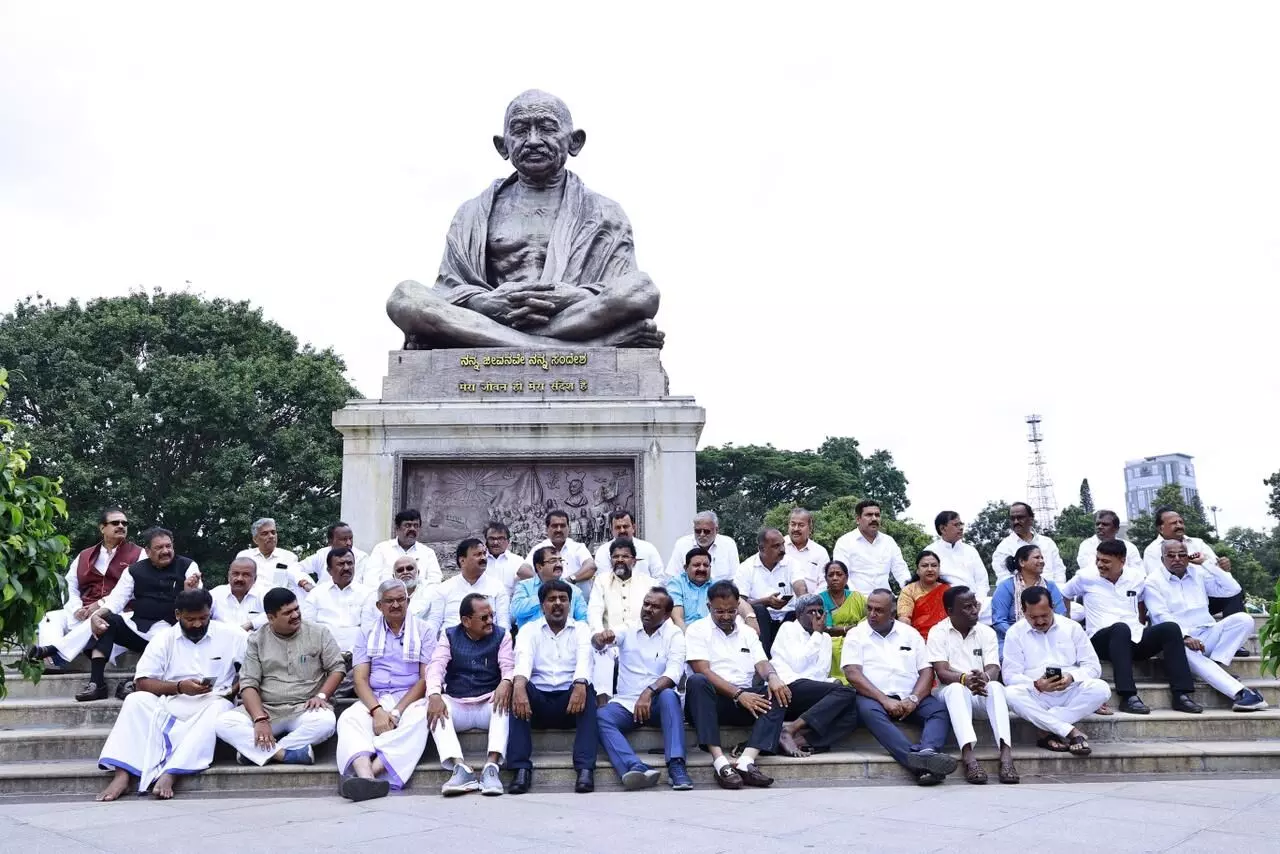ಬೆಂಗಳೂರು: ವಿಧಾನಸಭೆಯಿಂದ ಬಿಜೆಪಿಯ ಶಾಸಕರ ಅಮಾನತು ಖಂಡಿಸಿ ವಿಧಾನ ಸಭೆ, ಪರಿಷತ್ ಕಲಾಪ ಬಹಿಷ್ಕರಿಸಿದ ಬಿಜೆಪಿ ಶಾಸಕರು ವಿಧಾನಸೌಧದ ಗಾಂಧಿ ಪ್ರತಿಮೆ ಎದುರು ಶುಕ್ರವಾರ ಕೂಡ ಪ್ರತಿಭಟನೆ ಮುಂದುವರಿಸಿದ್ದಾರೆ.