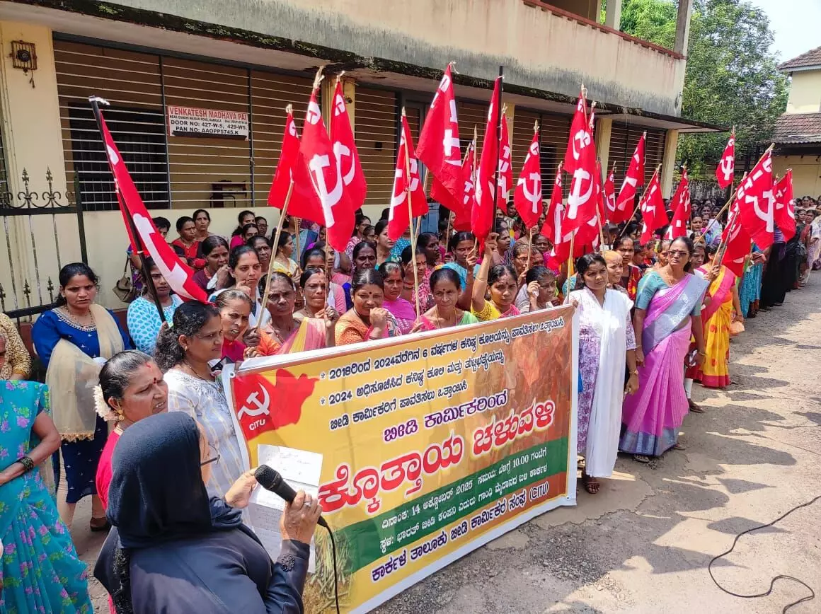 ಕಾರ್ಕಳ, ಅ.14: ಬೀಡಿ ಕಾರ್ಮಿಕರ ಸಮಸ್ಯೆಗಳನ್ನು ಕೂಡಲೇ ಬಗೆಹರಿಸು ವಂತೆ ಆಗ್ರಹಿಸಿ ದ.ಕ ಮತ್ತು ಉಡುಪಿ ಜಿಲ್ಲಾ ಬೀಡಿ ಕಾರ್ಮಿಕರ ಸಂಘಗಳ ಜಂಟಿ ಕ್ರೀಯಸಮಿತಿ ನೇತೃತ್ವದಲ್ಲಿ ಮಂಗಳವಾರ ಕಾರ್ಕಳದ ಭಾರತ್ ಬೀಡಿ ಕಂಪನಿ ಮುಂದೆ ಹಕ್ಕೊತ್ತಾಯ ಚಳುವಳಿ ನಡೆಸಲಾಯಿತು.
