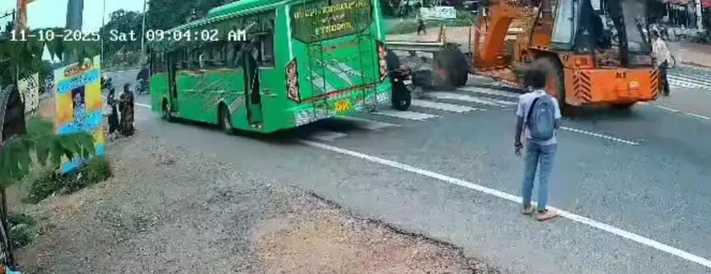 ಹೆದ್ದಾರಿ ಮೇಲೆ ಬಸ್- ಬೈಕ್ ಸವಾರನ ಮೇಲೆ ಹರಿದ ಕ್ರೇನ್