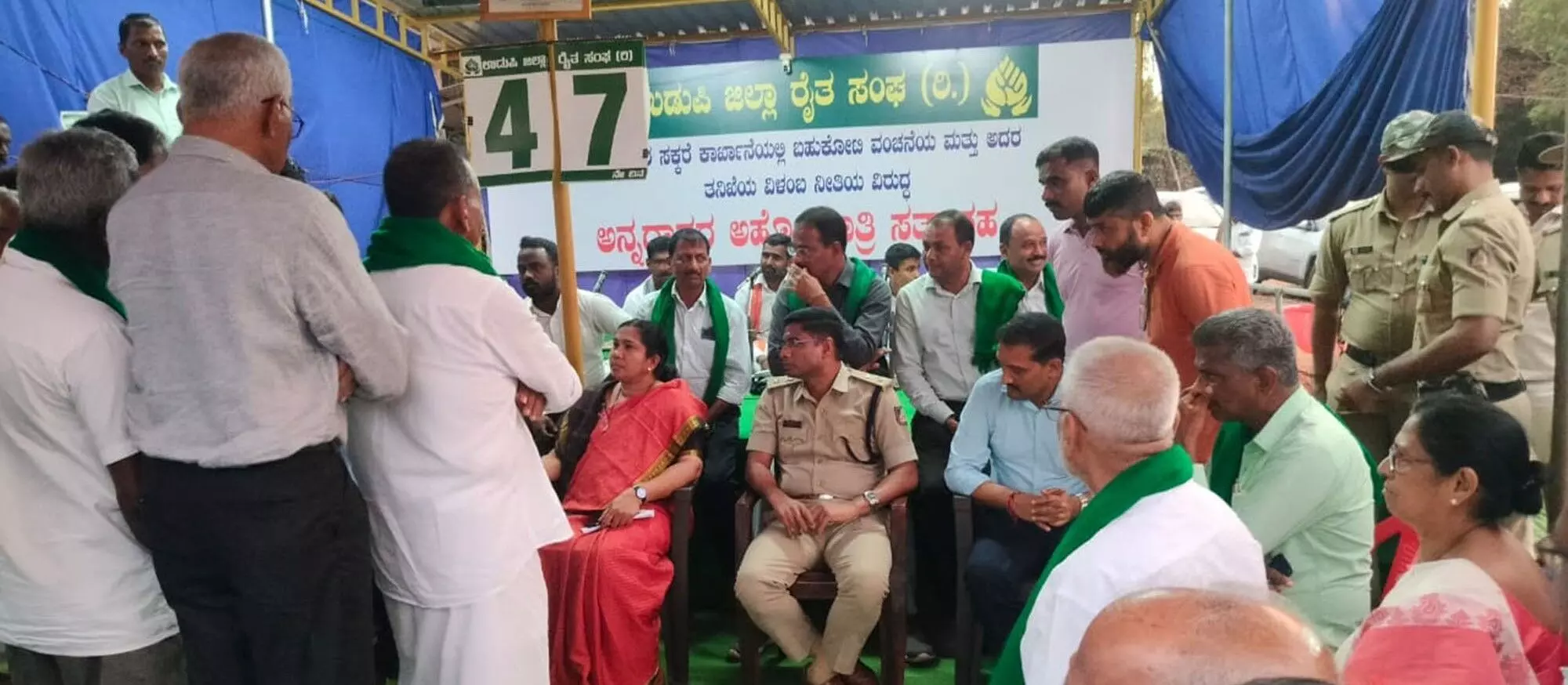 ಉಡುಪಿ ಜಿಲ್ಲಾ ರೈತ ಸಂಘದ ಅಧ್ಯಕ್ಷರೂ ಆಗಿರುವ ವಿಧಾನಪರಿಷತ್ನ ಮಾಜಿ ಸಭಾಪತಿ ಪ್ರತಾಪ್ ಚಂದ್ರ ಶೆಟ್ಟಿ ‘ವಾರ್ತಾಭಾರತಿ’ಗೆ ಈ ವಿಷಯ ತಿಳಿಸಿದ್ದಾರೆ. ಬುಧವಾರ ಸಂಜೆ ಧರಣಿ ಸ್ಥಳಕ್ಕೆ ಆಗಮಿಸಿದ ಜಿಲ್ಲಾಧಿಕಾರಿ ಡಾ. ಕೆ.ವಿದ್ಯಾಕುಮಾರಿ ಹಾಗೂ ಜಿಲ್ಲಾ ಪೊಲೀಸ್ ವರಿಷ್ಠಾಧಿಕಾರಿ ಡಾ.ಅರುಣ್ ಕೆ. ಅವರು ಧರಣಿ ನಿರತರ ಎಲ್ಲಾ ಬೇಡಿಕೆಗಳನ್ನು ಸರಕಾರ ಒಪ್ಪಿಕೊಂಡಿರುವುದಾಗಿ ತಿಳಿಸಿದ್ದು, ಧರಣಿಯನ್ನು ಹಿಂದೆಗೆದುಕೊಳ್ಳುವಂತೆ ಮನವಿ ಮಾಡಿದ್ದರು ಎಂದು ಅವರು ವಿವರಿಸಿದರು.
