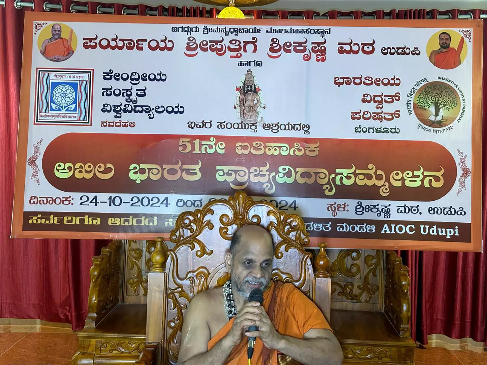 ಉಡುಪಿ, ಅ.14: ಪರ್ಯಾಯ ಶ್ರೀಪುತ್ತಿಗೆ ಶ್ರೀಕೃಷ್ಣ ಮಠದ ಆಶ್ರಯ ದಲ್ಲಿ ಹೊಸದಿಲ್ಲಿಯ ಕೇಂದ್ರೀಯ ಸಂಸ್ಕೃತ ವಿಶ್ವ ವಿದ್ಯಾಲಯ ಹಾಗೂ ಬೆಂಗಳೂರಿನ ಭಾರತೀಯ ವಿದ್ವತ್ ಪರಿಷತ್ಗಳ ಸಹಯೋಗದಲ್ಲಿ 51ನೇ ಅಖಿಲ ಭಾರತ ಪ್ರಾಚ್ಯ ವಿದ್ಯಾ ಸಮ್ಮೇಳನ (ಆಲ್ಇಂಡಿಯಾ ಓರಿಯೆಂಟಲ್ ಕಾನ್ಫರೆನ್ಸ್) ಅ.24ರಿಂದ 26ರವರೆಗೆ ಶ್ರೀಕೃಷ್ಣ ಮಠದ ರಾಜಾಂಗಣದಲ್ಲಿ ನಡೆಯಲಿದೆ ಎಂದು ಪರ್ಯಾಯ ಪುತ್ತಿಗೆ ಮಠದ ಶ್ರೀಸುಗುಣೇಂದ್ರತೀರ್ಥರು ತಿಳಿಸಿದ್ದಾರೆ.