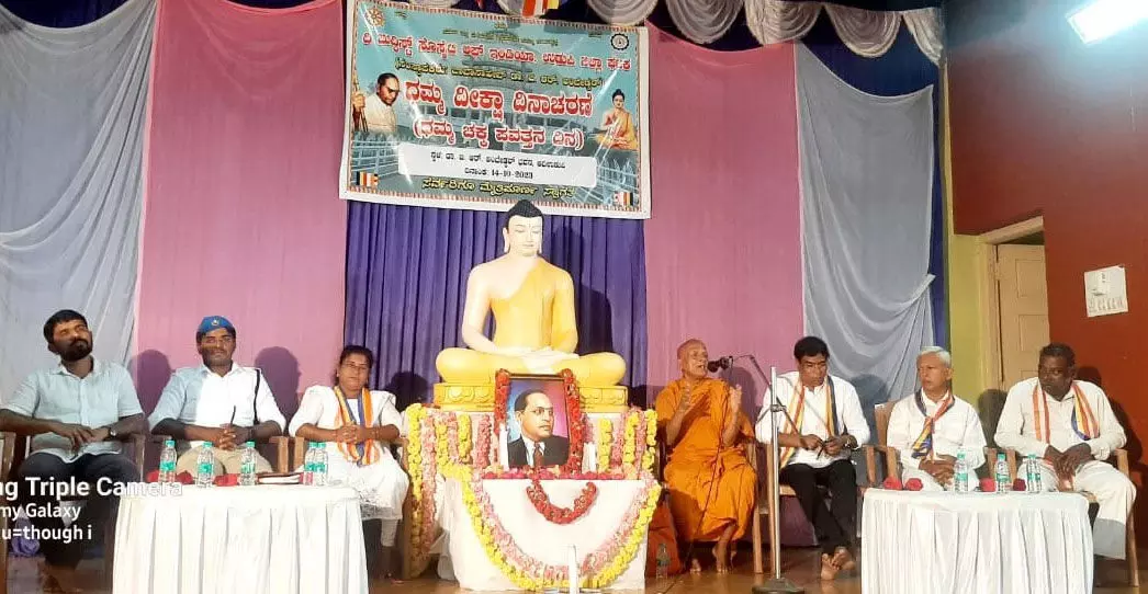 ಉಡುಪಿ : ದಿ ಬುದಿಸ್ಟ್ ಸೊಸೈಟಿ ಆಫ್ ಇಂಡಿಯಾ ಉಡುಪಿ ಜಿಲ್ಲಾ ಘಟಕದ ವತಿಯಿಂದ ಬಾಬಾ ಸಾಹೇಬ್ ಡಾ.ಬಿ.ಆರ್. ಅಂಬೇಡ್ಕರ್ ನಾಗಪುರ ದಲ್ಲಿ ಲಕ್ಷಾಂತರ ಅನುಯಾಯಿಗಳೊಂದಿಗೆ ಬೌದ್ಧ ಧಮ್ಮಕ್ಕೆ ಮರಳಿದ ವಾರ್ಷಿಕ ದಿನದ ಪ್ರಯುಕ್ತ ಧಮ್ಮ ದೀಕ್ಷಾ ದಿನಾಚರಣೆ(ಧಮ್ಮ ಚಕ್ಕ ಪವತ್ತನ ದಿನ) ಕಾರ್ಯಕ್ರಮವನ್ನು ಆದಿಉಡುಪಿಯ ಅಂಬೇಡ್ಕರ್ ಭವನದಲ್ಲಿ ಶನಿವಾರ ಆಯೋಜಿಸಲಾಗಿತ್ತು.