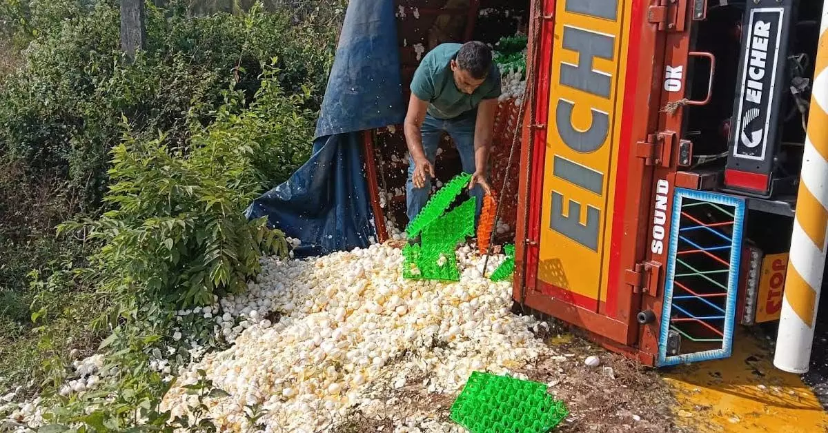 Karkala | ನಿಟ್ಟೆಯಲ್ಲಿ ಲಾರಿ, ಕಾರುಗಳ ಮಧ್ಯೆ ಸರಣಿ ಅಪಘಾತ: ಮೊಟ್ಟೆ ಲಾರಿ ಪಲ್ಟಿ, ಅಪಾರ ನಷ್ಟ
