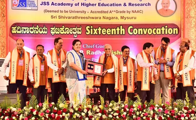 ಕುಂದಾಪುರ, ನ.14: ಮೈಸೂರಿನ ಜೆಎಸ್ಎಸ್ ವೈದ್ಯಕೀಯ ಕಾಲೇಜಿನಲ್ಲಿ ಇತ್ತೀಚೆಗೆ ನಡೆದ ಜೆಎಸ್ಎಸ್ ಅಕಾಡೆಮಿ ಆಫ್ ಹೈಯರ್ ಎಜುಕೇಶನ್ ಅಂಡ್ ರಿಸರ್ಚ್ ನ 16ನೇ ಘಟಿಕೋತ್ಸವ ಸಮಾರಂಭದಲ್ಲಿ, ಕಮ್ಯುನಿಟಿ ಮೆಡಿಸಿನ್ ವಿಭಾಗದ ವೈದ್ಯಕೀಯ ಸ್ನಾತಕೋತ್ತರ ಪದವಿ ಅಧ್ಯಯನದಲ್ಲಿ ಪ್ರಾವೀಣ್ಯತೆ ತೋರಿ ಚಿನ್ನದ ಪದಕ ಹಾಗೂ ಅತ್ಯುತ್ತಮ ಶೈಕ್ಷಣಿಕ ಸಾಧನೆಯನ್ನು ಮಾಡಿರುವ ಕುಂದಾಪುರ ಮೂಲದ ಡಾ.ಶೃದ್ಧಾ ಅವರನ್ನು ಗೌರವಿಸಲಾಯಿತು.