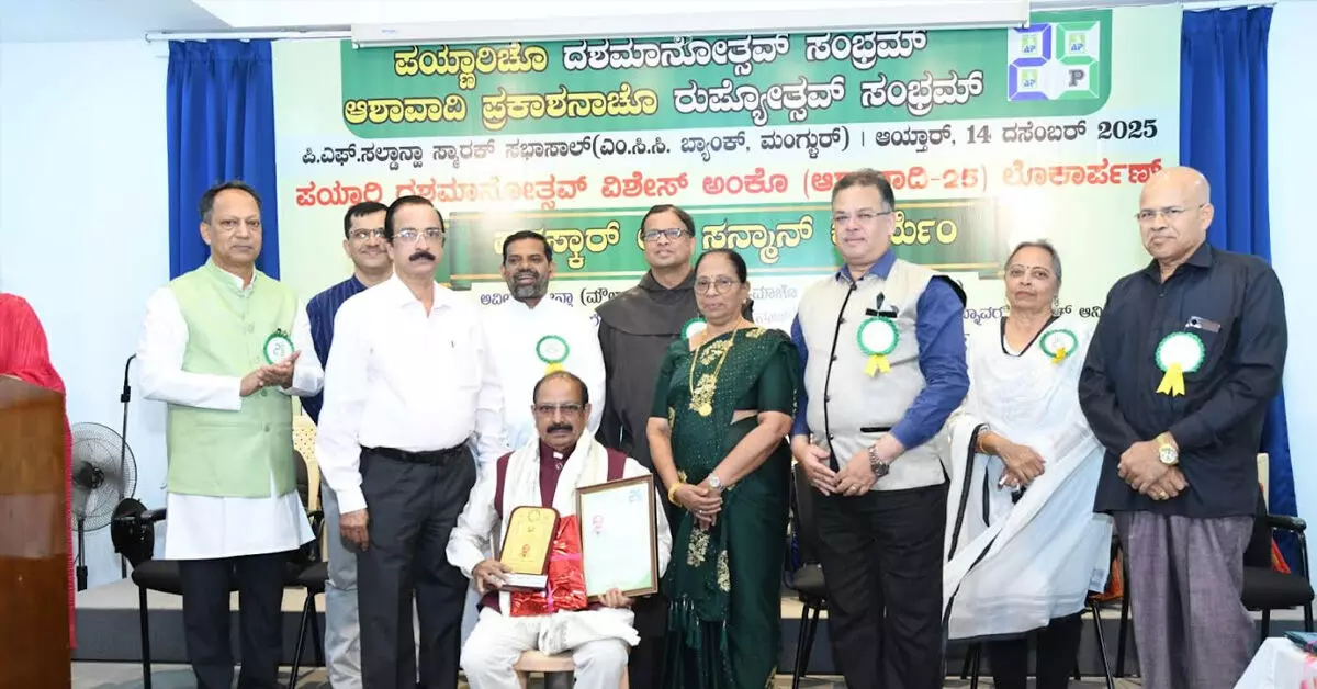 ಕುಂದಾಪುರ, ಡಿ.17: ಕೊಂಕಣಿಯ ಸಾಹಿತಿ ವಾಲೇರಿಯನ್ ಕ್ವಾಡರ್ಸ್ ಇವರ ಆಶಾವಾದಿ ಪ್ರಕಾಶನದ ಬೆಳ್ಳಿ ಹಬ್ಬ ಮತ್ತು ಪಯ್ಣಾರಿ ಸುದ್ದಿ ಸಂಸ್ಥೆಯ ದಶಮಾನೋತ್ಸವ ಸಂಭ್ರಮದ ವೇಳೆ, ಕೊಂಕಣಿಯಲ್ಲಿ ಸಾಹಿತ್ಯ, ಸಾಮಾಜಿಕ ಸೇವೆ, ಇನ್ನಿತರ ಕ್ಷೇತ್ರದಲ್ಲಿ ವಿಶೇಷ ಸೇವೆ ನೀಡಿದವರ ಜೊತೆ ಕುಂದಾಪುರದ ಸಾಹಿತಿ, ಕವಿ, ನಾಟಕಾರ, ಹಾಗೂ ಮಾಧ್ಯಮದ ಸೇವೆಯನ್ನು ಪರಿಗಣಿಸಿ ಬರ್ನಾಡ್ ಡಿಕೋಸ್ತಾ ಅವರನ್ನು ಡಿ.14ರಂದು ಮಂಗಳೂರಿನ ಹಂಪನ್ ಕಟ್ಟೆಯ ಎಂ.ಸಿ.ಸಿ. ಬ್ಯಾಂಕಿನ ಸಭಾಭವನದಲ್ಲಿ ಸನ್ಮಾನಿಸಿ ಪುರಸ್ಕರಿಸಲಾಯಿತು.
