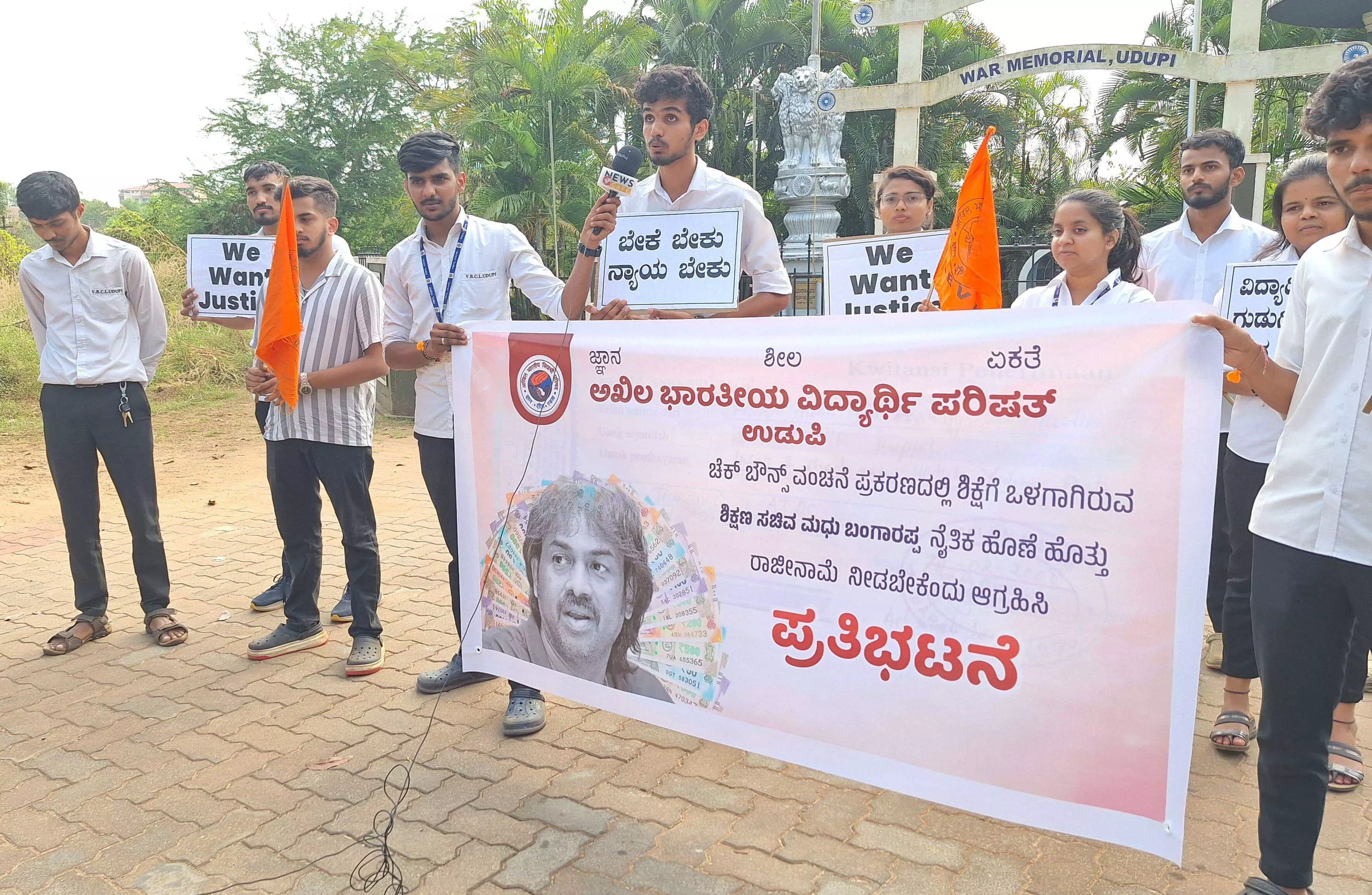 ಉಡುಪಿ, ಜ.2: ಚೆಕ್ ಬೌನ್ಸ್ ವಂಚನೆ ಪ್ರಕರಣದಲ್ಲಿ ಶಿಕ್ಷೆಗೆ ಒಳಗಾಗಿರುವ ಶಿಕ್ಷಣ ಸಚಿವ ಮಧು ಬಂಗಾರಪ್ಪನೈತಿಕ ಹೊಣೆ ಹೊತ್ತು ರಾಜೀನಾಮೆ ನೀಡಬೇಕೆಂದು ಆಗ್ರಹಿಸಿ ಅಖಿಲ ಭಾರತೀಯ ವಿದ್ಯಾರ್ಥಿ ಪರಿಷತ್ ಉಡುಪಿ ನಗರ ವತಿಯಿಂದ ಅಜ್ಜರಕಾಡಿನ ಹುತಾತ್ಮರ ಸ್ಮಾರಕದ ಬಳಿ ಇಂದು ಧರಣಿ ನಡೆಸಲಾಯಿತು.