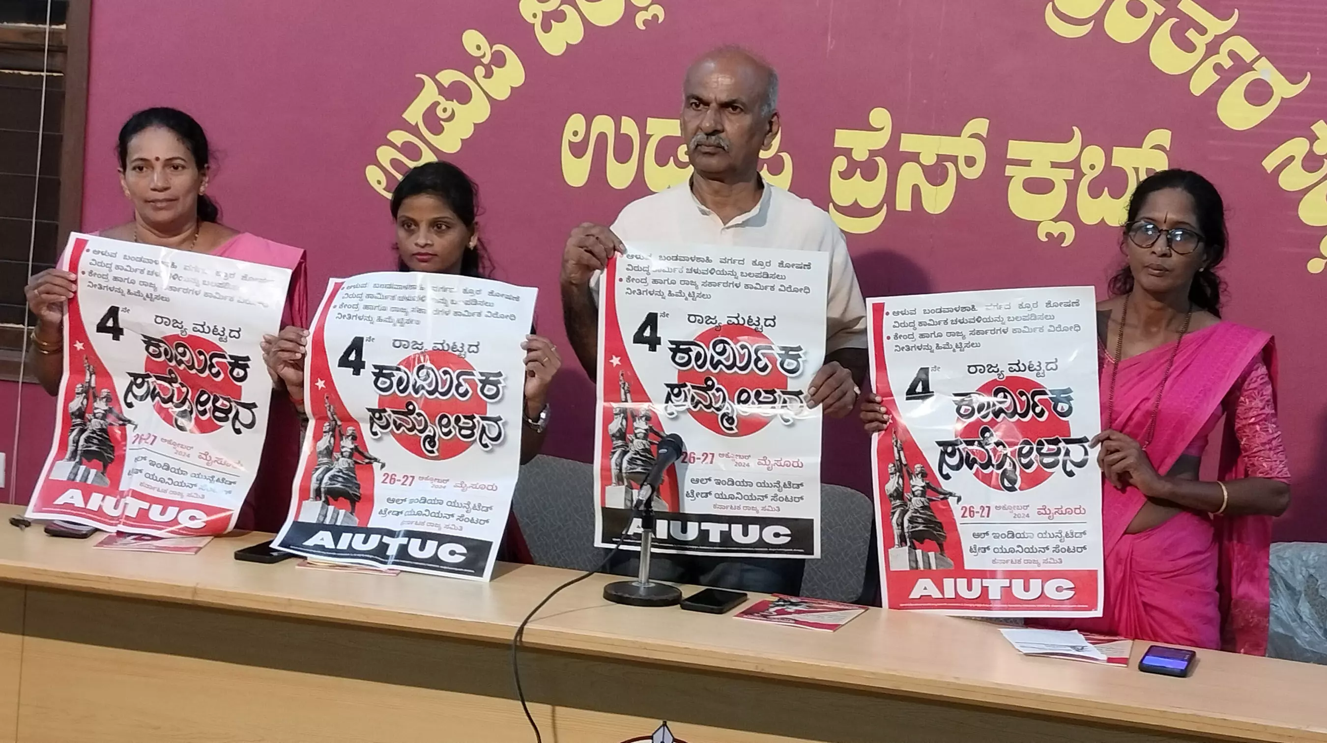 ಉಡುಪಿ, ಅ.23: ಕೇಂದ್ರೀಯ ಕಾರ್ಮಿಕ ಸಂಘಟನೆ ಆಲ್ ಇಂಡಿಯಾ ಯುನೈಟೆಡ್ ಟ್ರೇಡ್ ಯೂನಿಯನ್ ಸೆಂಟರ್ (ಎಐಯುಟಿಯುಸಿ)ನ ಕರ್ನಾಟಕ ರಾಜ್ಯ ಸಮಿತಿಯು ಅ.26 ಮತ್ತು 27ರಂದು ಮೈಸೂರಿನಲ್ಲಿ ಎರಡು ದಿನಗಳ ಕಾಲ 4ನೇ ರಾಜ್ಯಮಟ್ಟದ ಕಾರ್ಮಿಕ ಸಮ್ಮೇಳನವನ್ನು ಮಹಾರಾಜ ಕಾಲೇಜಿನ ಶತಮಾನೋತ್ಸವ ಭವನದಲ್ಲಿ ಆಯೋಜಿಸಿದೆ ಎಂದು ಸಮಿತಿಯ ರಾಜ್ಯ ಉಪಾಧ್ಯಕ್ಷ ಕೆ.ವಿ.ಭಟ್ ತಿಳಿಸಿದ್ದಾರೆ.