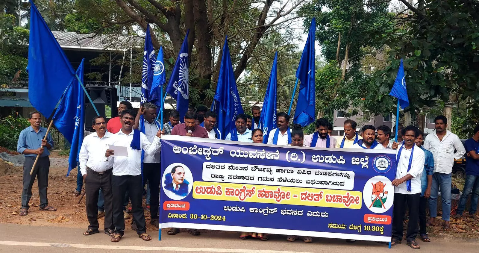 ಉಡುಪಿ, ಅ.30: ಉಡುಪಿ ಜಿಲ್ಲೆ ಅಂಬೇಡ್ಕರ್ ಯುವಸೇನೆ ವತಿಯಿಂದ ದಲಿತರ ಮೇಲಿನ ದೌರ್ಜನ್ಯ ಹಾಗೂ ವಿವಿಧ ಬೇಡಿಕೆಗಳನ್ನು ರಾಜ್ಯ ಸರಕಾರದ ಗಮನ ಸೆಳೆಯಲು ವಿಫಲರಾಗಿರುವ ಕಾಂಗ್ರೆಸ್ ವಿರುದ್ಧ ಬುಧವಾರ ಉಡುಪಿ ಕಾಂಗ್ರೆಸ್ ಭವನದ ಎದುರು ಪ್ರತಿಭಟನೆ ನಡೆಸಲಾಯಿತು.