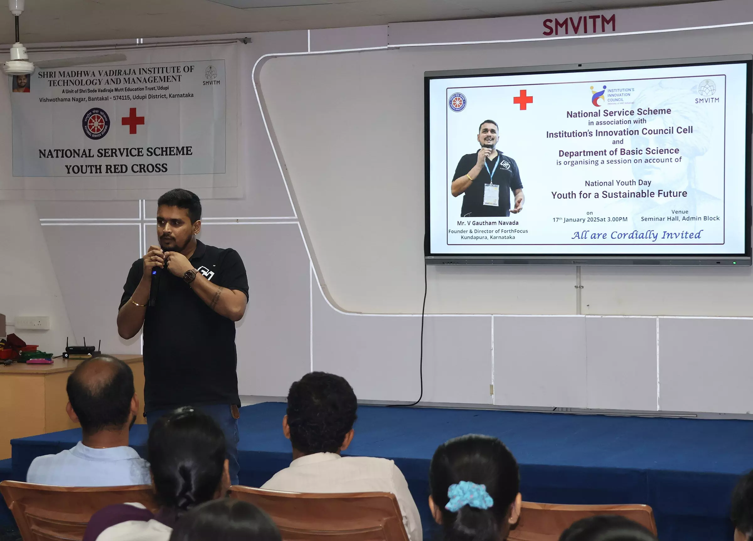 ಉಡುಪಿ, ಜ.20: ಶ್ರೀಮಧ್ವ ವಾದಿರಾಜ ತಾಂತ್ರಿಕ ಮಹಾವಿದ್ಯಾಲಯದ ರಾಷ್ಟ್ರೀಯ ಸೇವಾ ಯೋಜನೆಯ ವತಿಯಿಂದ ವಿದ್ಯಾಸಂಸ್ಥೆಯ ಇನ್ನೋವೇಶನ್ ಘಟಕ ಮತ್ತು ಮೂಲ ವಿಜ್ಞಾನ ವಿಭಾಗದ ಸಹಯೋಗದೊಂದಿಗೆ ವಿದ್ಯಾರ್ಥಿಗಳಲ್ಲಿ ಉದ್ಯಮ ಶೀಲತೆಯ ಮನೋಭಾವವನ್ನು ಉತ್ತೇಜಿಸುವ ಸಲುವಾಗಿ ರಾಷ್ಟ್ರೀಯ ಯುವದಿನದ ಅಂಗವಾಗಿ ಸುಸ್ಥಿರ ಭವಿಷ್ಯಕ್ಕಾಗಿ ಯುವಕರು ಎಂಬ ವಿಷಯದ ಕುರಿತು ಉಪನ್ಯಾಸ ಕಾರ್ಯಕ್ರಮ ಇತ್ತೀಚೆಗೆ ಜರಗಿತು.