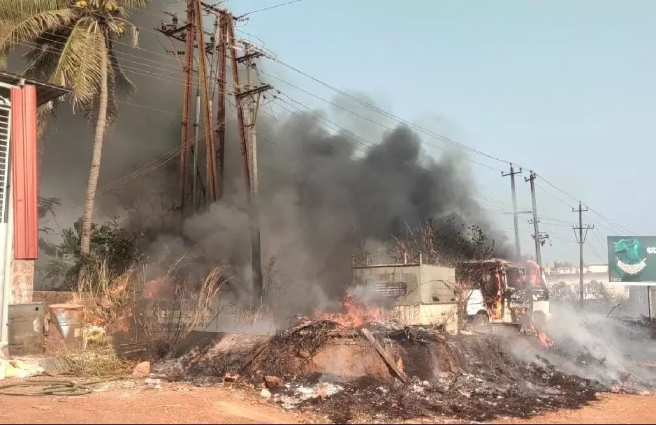 ಕುಂದಾಪುರ, ಫೆ.16: ತ್ರಾಸಿ ಜಂಕ್ಷನ್ ಬಳಿ ಕುರುಚಲು ಗಿಡಗಳಿರುವ ಪ್ರದೇಶಕ್ಕೆ ಆಕಸ್ಮಿಕ ಬೆಂಕಿ ತಗುಲಿದ ಪರಿಣಾಮ ಅಲ್ಲೇ ಸಮೀಪದಲ್ಲಿ ರಿಪೇರಿ ಗಾಗಿ ನಿಲ್ಲಿಸಿದ್ದ ವಾಹನಗಳಿಗೆ ಹಾನಿಯಾಗಿರುವ ಘಟನೆ ರವಿವಾರ ಸಂಜೆ ನಡೆದಿದೆ.