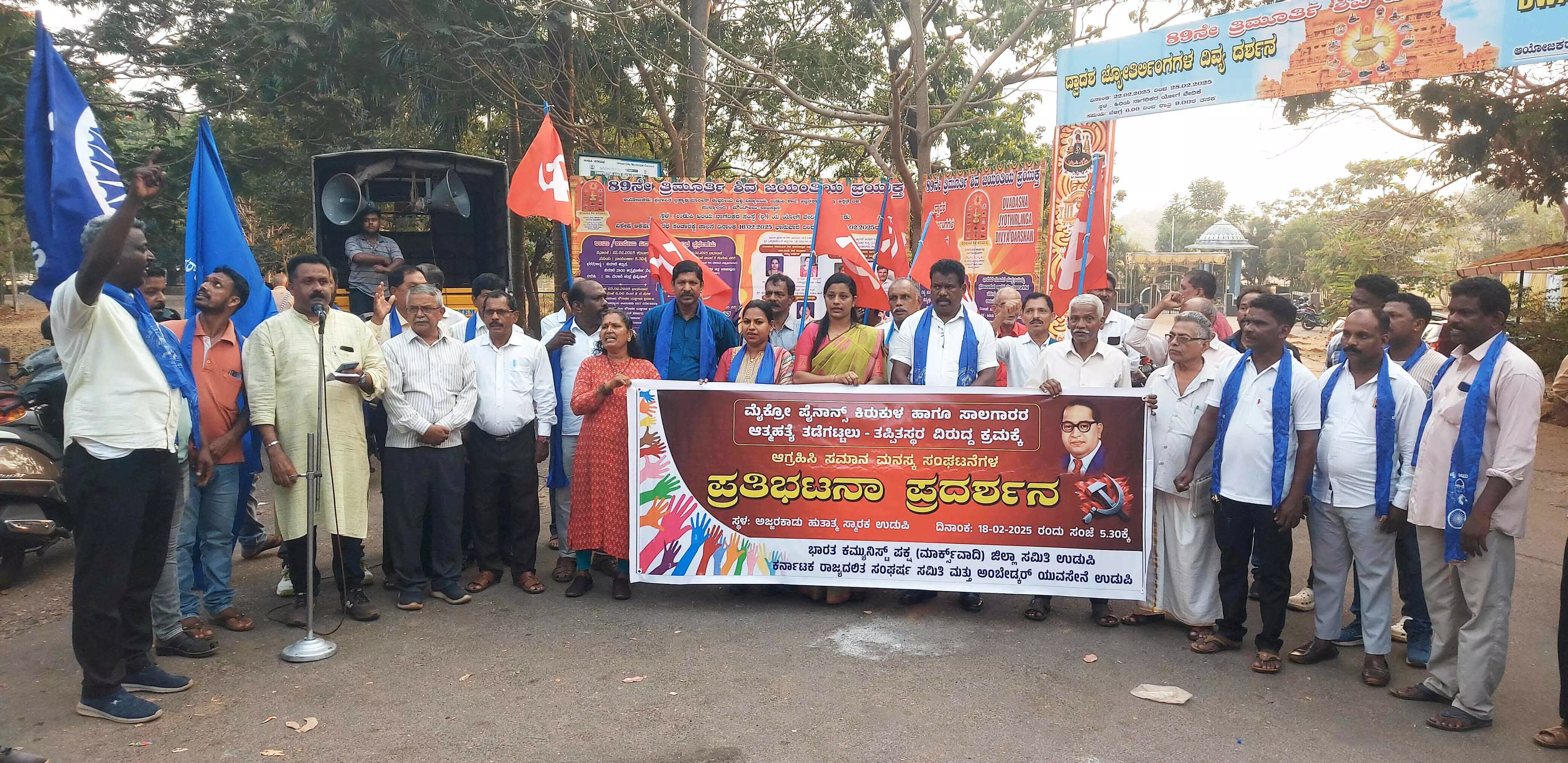 ಉಡುಪಿ, ಫೆ.18: ಮೈಕ್ರೋ ಫೈನಾನ್ಸ್ ಕಿರುಕುಳ ಹಾಗೂ ಸಾಲಗಾರರ ಆತ್ಮಹತ್ಯೆ ತಡೆಗಟ್ಟಲು ಮತ್ತು ಸೂಕ್ತ ಕಾನೂನು ರೂಪಿಸಲು ಆಗ್ರಹಿಸಿ ಸಿಪಿಎಂ ಉಡುಪಿ ಜಿಲ್ಲಾ ಸಮಿತಿ ಹಾಗೂ ಕರ್ನಾಟಕ ರಾಜ್ಯ ದಲಿತ ಸಂಘರ್ಷ ಸಮಿತಿ ಮತ್ತು ಉಡುಪಿ ಜಿಲ್ಲಾ ಅಂಬೇಡ್ಕರ್ ಯುವಸೇನೆ ನೇತೃತ್ವದಲ್ಲಿ ಮಂಗಳವಾರ ಅಜ್ಜರಕಾಡು ಹುತಾತ್ಮ ಸ್ಮಾರಕದ ಎದುರು ಧರಣಿ ನಡೆಸಲಾಯಿತು.