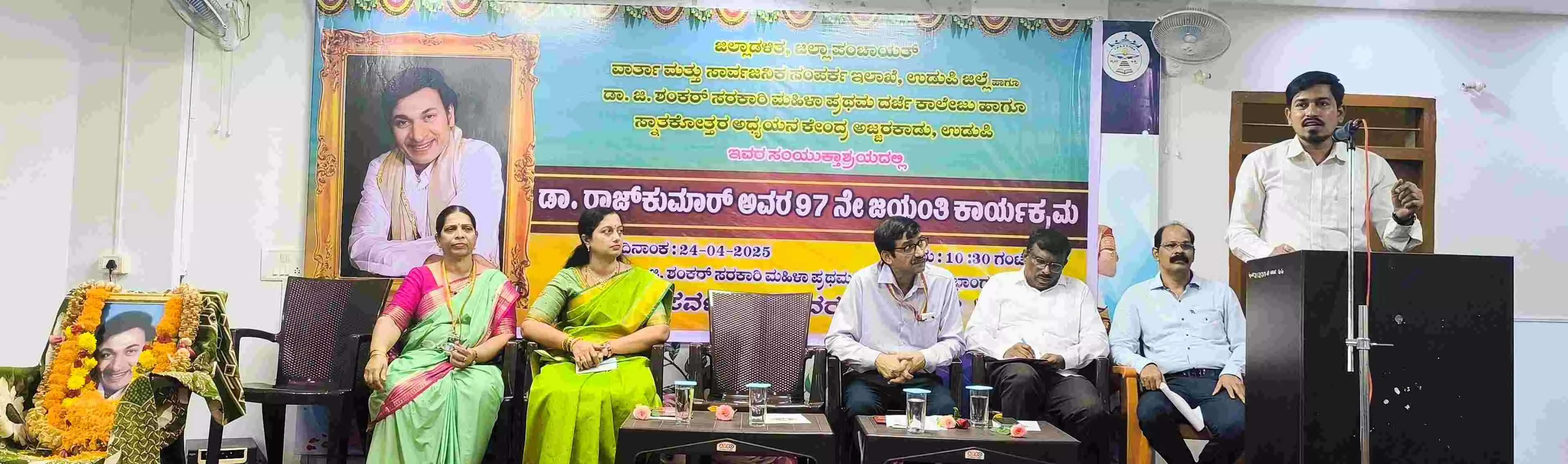 ನಗರದ ಅಜ್ಜರಕಾಡು ಡಾ.ಜಿ.ಶಂಕರ್ ಸರಕಾರಿ ಮಹಿಳಾ ಪ್ರಥಮ ದರ್ಜೆ ಕಾಲೇಜಿನ ಸ್ನಾತಕೋತ್ತರ ಅಧ್ಯಯನ ಕೇಂದ್ರದ ಸಭಾಂಗಣದಲ್ಲಿ, ಜಿಲ್ಲಾಡಳಿತ, ಜಿಲ್ಲಾ ಪಂಚಾಯತ್, ವಾರ್ತಾ ಮತ್ತು ಸಾರ್ವಜನಿಕ ಸಂಪರ್ಕ ಇಲಾಖೆ ಉಡುಪಿ ಹಾಗೂ ಡಾ.ಜಿ.ಶಂಕರ್ ಸರಕಾರಿ ಮಹಿಳಾ ಪ್ರಥಮ ದರ್ಜೆ ಕಾಲೇಜು ಹಾಗೂ ಸ್ನಾತಕೋತ್ತರ ಅಧ್ಯಯನ ಕೇಂದ್ರಗಳ ಸಂಯುಕ್ತ ಆಶ್ರಯದಲ್ಲಿ ನಡೆದ ವರನಟ ಡಾ.ರಾಜ್ ಕುಮಾರ್ ಅವರ 97ನೇ ಜಯಂತಿ ಕಾರ್ಯಕ್ರಮವನ್ನು ಉದ್ಘಾಟಿಸಿ, ಡಾ. ರಾಜ್ಕುಮಾರ್ ಭಾವಚಿತ್ರಕ್ಕೆ ಪುಷ್ಪಾರ್ಚನೆ ಸಲ್ಲಿಸಿ ಅವರು ಮಾತನಾಡುತ್ತಿದ್ದರು.