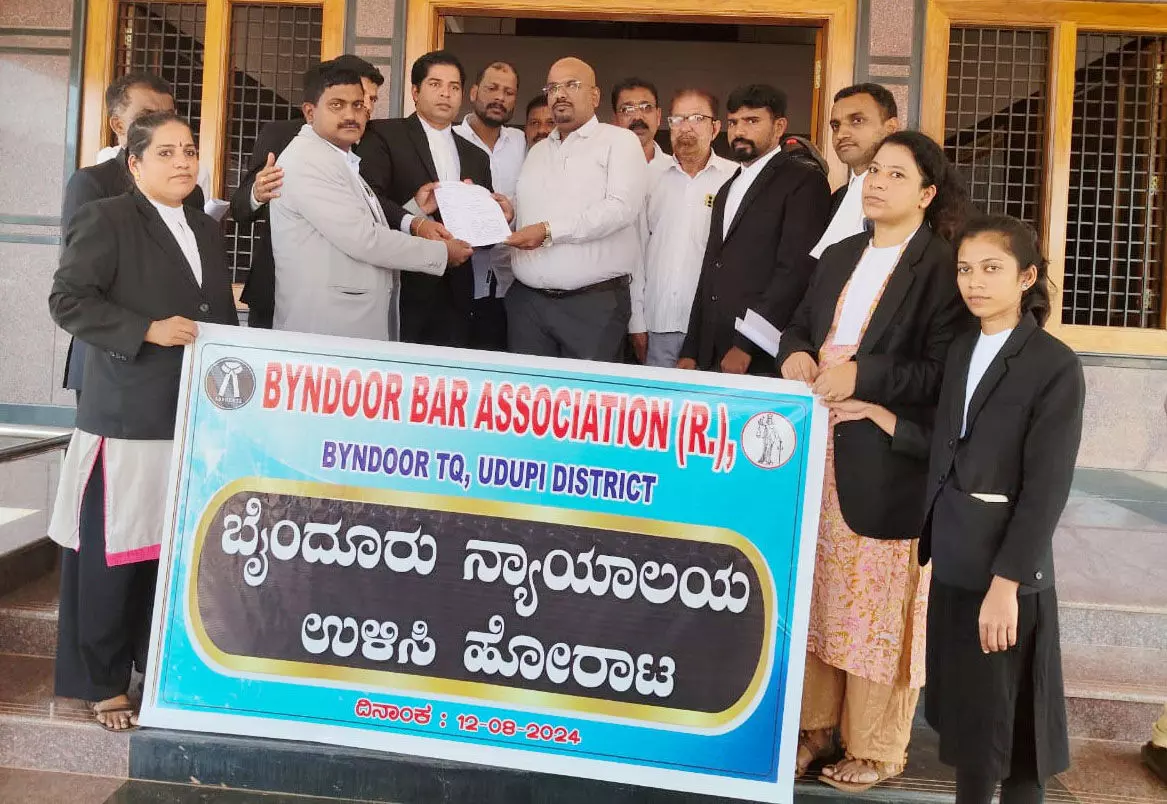 ಬೈಂದೂರು ತಾಲೂಕು ವಕೀಲರ ಸಂಘದ ಸದಸ್ಯರು ಜಾಥಾ ಮೂಲಕ ತಹಶೀಲ್ದಾರರಿಗೆ ಮನವಿ ಸಲ್ಲಿಸಿದರು. ಈ ಸಂದರ್ಭದಲ್ಲಿ ವಕೀಲ ಪ್ರಶಾಂತ ಪೂಜಾರಿ, ಲಿಂಗಪ್ಪ ಮೇಸ್ತ ಹಾಗೂ ವಕೀಲರ ಸಂಘದ ಸದಸ್ಯರು ಹಾಜರಿದ್ದರು.
