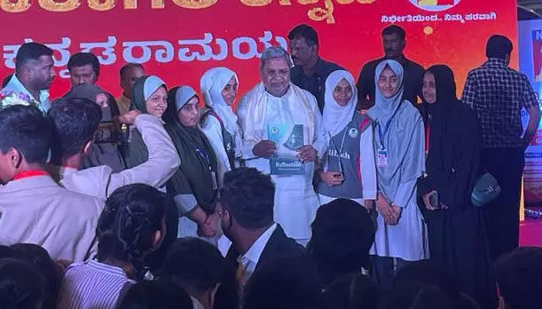 ಉಡುಪಿ : ಖಾಸಗಿ ಸುದ್ದಿ ವಾಹಿನಿ ವತಿಯಿಂದ ಕನ್ನಡಕ್ಕೆ 50ರ ಸಂಭ್ರಮ ಪ್ರಯುಕ್ತ ಬೆಂಗಳೂರಿನಲ್ಲಿ ಮಂಗಳವಾರ ನಡೆದ ಮುಖ್ಯಮಂತ್ರಿ ಸಿದ್ದರಾಮಯ್ಯ ಅವರೊಂದಿಗೆ ವಿದ್ಯಾರ್ಥಿಗಳ ಸಂವಾದ ಕಾರ್ಯಕ್ರಮದಲ್ಲಿ ಭಾಗವಹಿಸಿದ್ದ ಉಡುಪಿ ಹೂಡೆಯ ಸಾಲಿಹಾತ್ ಶಾಲೆಯ ವಿದ್ಯಾರ್ಥಿಗಳು ಮುಖ್ಯಮಂತ್ರಿಗಳಿಗೆ ಸಾಲಿಹಾತ್ ಶಾಲೆಯ ಸ್ಮರಣ ಸಂಚಿಕೆಯನ್ನು ನೀಡಿದರು.