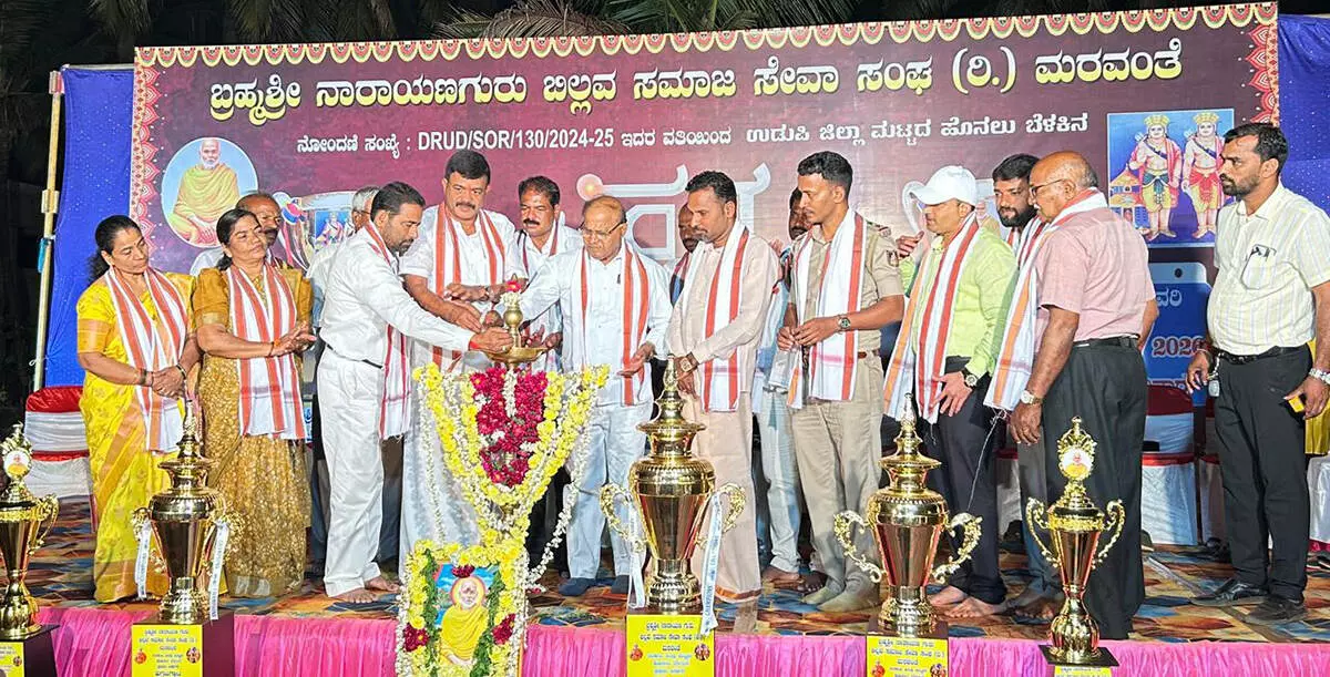 ಕುಂದಾಪುರ, ಜ.19: ಬ್ರಹ್ಮಶ್ರೀ ನಾರಾಯಣ ಗುರು ಬಿಲ್ಲವ ಸಮಾಜ ಸೇವಾ ಸಂಘ ಮರವಂತೆ ವತಿಯಿಂದ ಉಡುಪಿ ಜಿಲ್ಲಾ ಮಟ್ಟದ ಹೊನಲು ಬೆಳಕಿನ ಪ್ರಥಮ ವರ್ಷದ ಹಗ್ಗ ಜಗ್ಗಾಟ ಸ್ಪರ್ಧೆ ‘ಬ್ರಹ್ಮಶ್ರೀ ನಾರಾಯಣ ಗುರು ಟ್ರೋಫಿ’ಯು ಶನಿವಾರ ಮರವಂತೆಯ ಶ್ರೀಸುಬ್ರಹ್ಮಣ್ಯ ದೇವಸ್ಥಾನದ ಎದುರು ನಡೆಯಿತು.