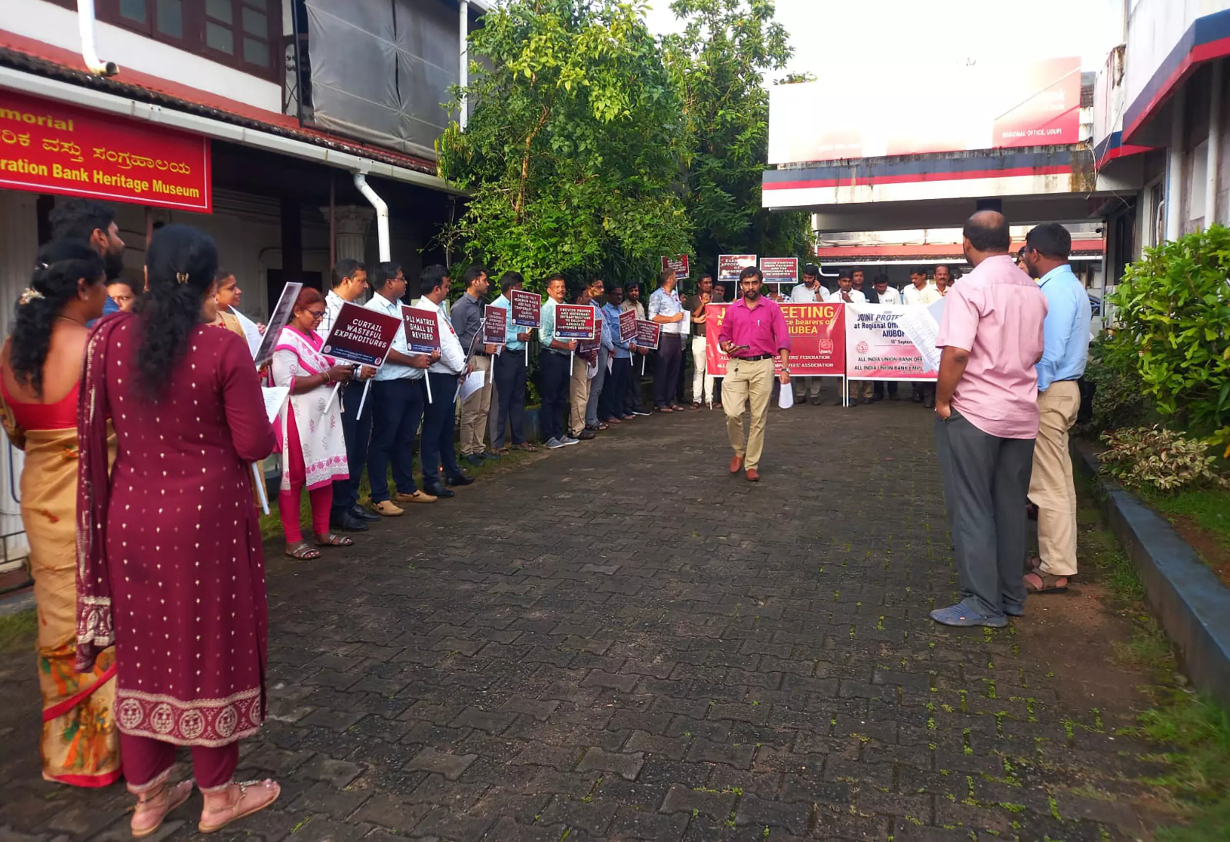 ಯೂನಿಯನ್ ಬ್ಯಾಂಕ್ನಲ್ಲಿರುವ ಜ್ವಲಂತ ಸಮಸ್ಯೆಗಳ ತ್ವರಿತ ಪರಿಹಾರ ಕ್ಕಾಗಿ ಬ್ಯಾಂಕಿನ ಅಧಿಕಾರಿಗಳು ಮತ್ತು ಸಿಬ್ಬಂದಿ ವರ್ಗ ಇಂದಿನ ಪ್ರತಿಭಟನೆ ಯಲ್ಲಿ ಪಾಲ್ಗೊಂಡಿದ್ದು, ತಮ್ಮ ನ್ಯಾಯಯುತ ಬೇಡಿಕೆಗೆ ಕೂಡಲೇ ಸಕಾರಾತ್ಮಕವಾಗಿ ಸ್ಪಂದಿಸುವಂತೆ ಆಡಳಿತದ ಮುಂದೆ ಬೇಡಿಕೆ ಇಟ್ಟರು.