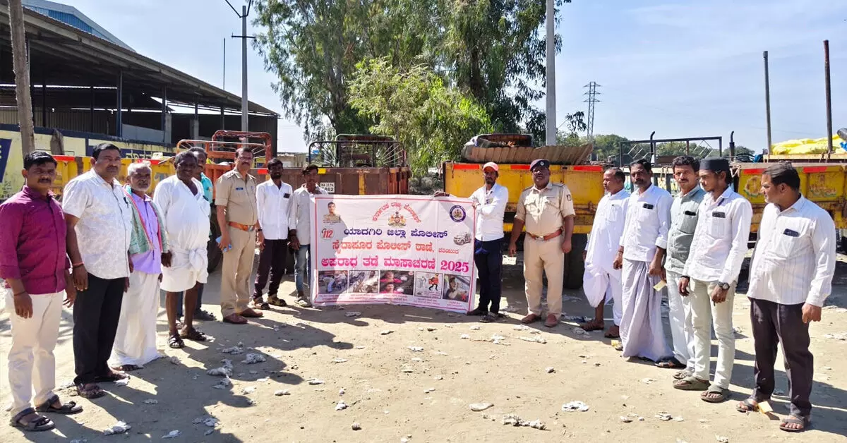 ಪಟ್ಟಣಕ್ಕೆ ಹತ್ತಿ ತುಂಬಿಕೊಂಡು ಆಗಮಿಸಿದ ಟ್ರಾಕ್ಟರ್, ಬೊಲೇರೋ, ಟೆಂಪೋ ವಾಹನ ಚಾಲಕರನ್ನು ಹಾಗೂ ರೈತರನ್ನು ಒಂದೆಡೆ ಸೇರಿಸಿ ಅಪರಾಧ ತಡೆ ಮಾಸಾಚರಣೆ ಕಾರ್ಯಕ್ರಮದ ಬಗ್ಗೆ ಮಾಹಿತಿ ನೀಡಿ ಅವರು ಮಾತನಾಡಿದರು.